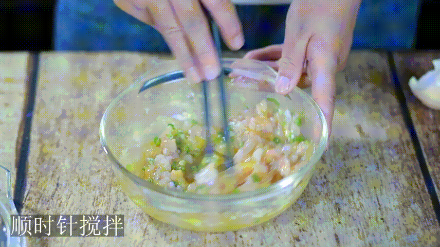 4、加入切好的葱段、鸡蛋、生抽、盐、白胡椒、淀粉,顺时针搅拌。