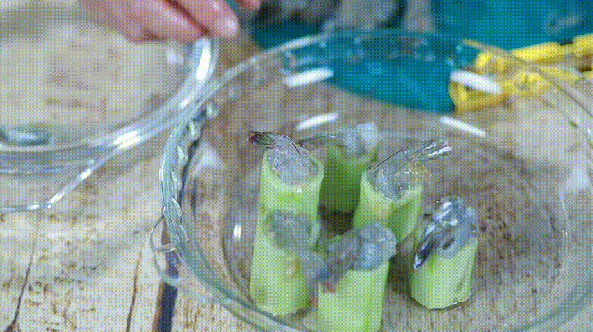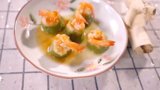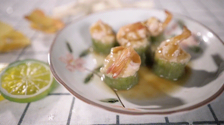 5、将搅拌好的虾泥塞进掏空的丝瓜里,将完整的鲜虾点缀在上面摆盘。