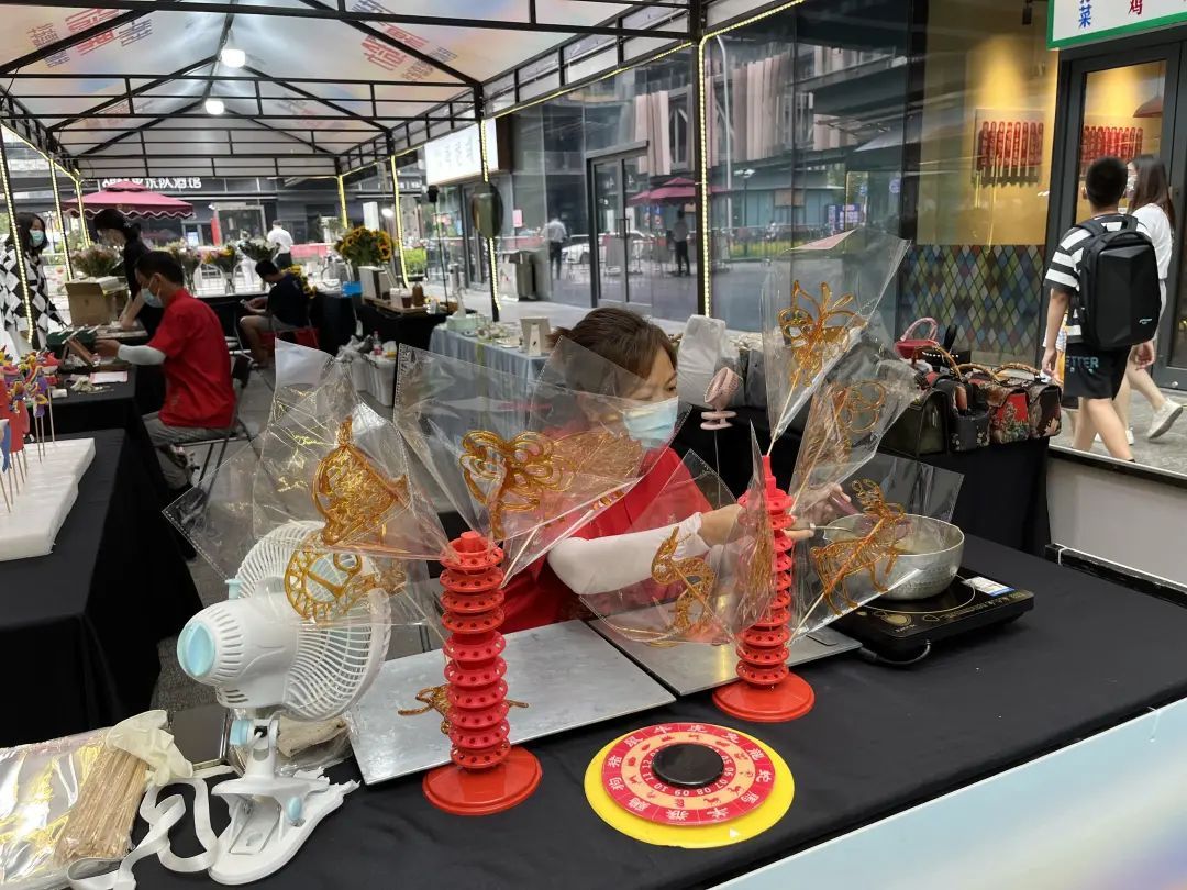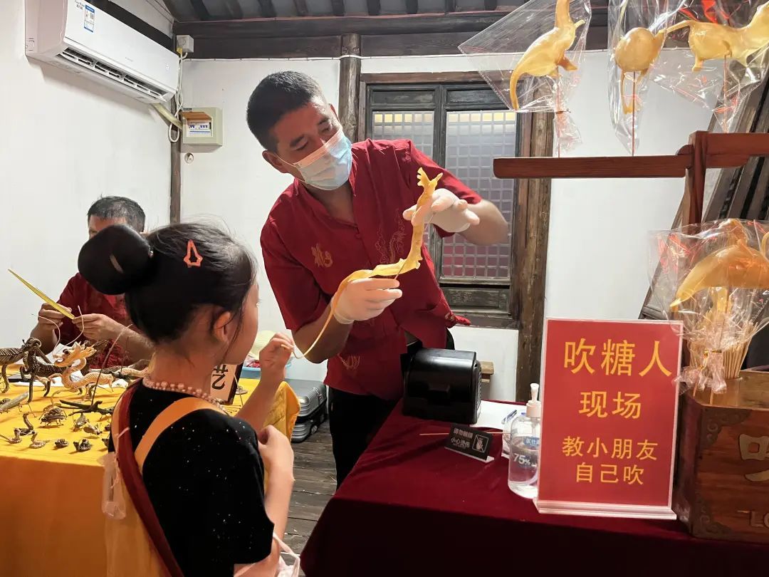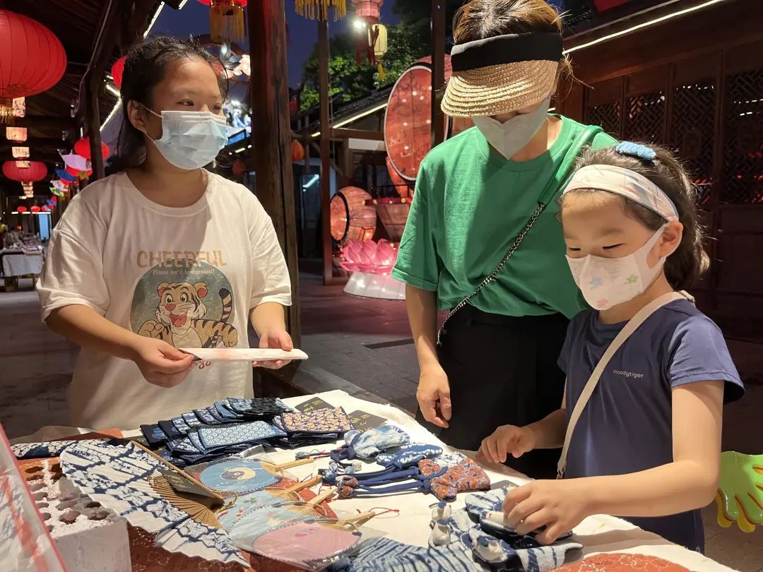 夜幕降临,爱企谷集市的复古文创一条街美轮美奂,年轻人徜徉在各个传统民俗彩灯前打卡留影,孩子们则穿梭于众多民俗手工摊位前流连忘返,有的看中了土布扇子驻足挑选,有的在手工艺人的指导下尝试着人生第一次吹糖人,围观的小伙伴又羡慕又惊奇。