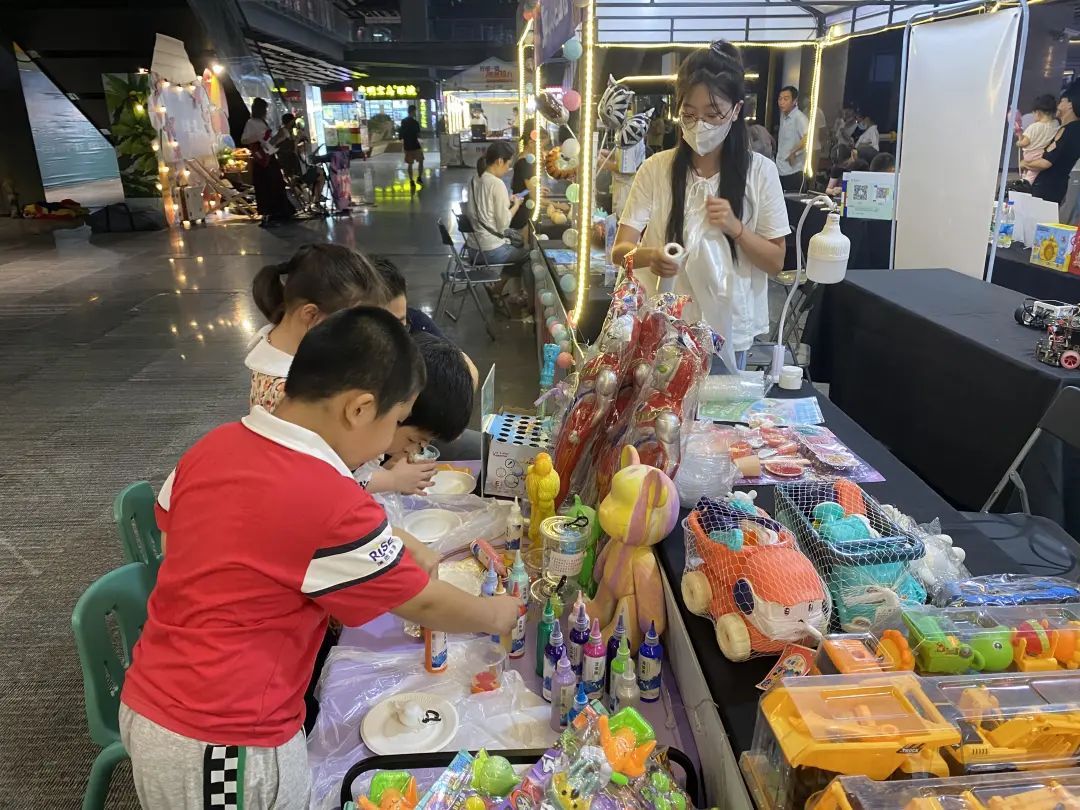 下午4点,传悦坊的仲夏嘉年华开市,在北侧露天广场,民俗文化区、游戏互动区和美食区一字排开,冰激凌饮料餐车错落其中,方便市民边逛边玩,边玩边吃。年轻人对民间传统手艺十分感兴趣,边看边问,小朋友则被各种手工摊位吸引,跃跃欲试。