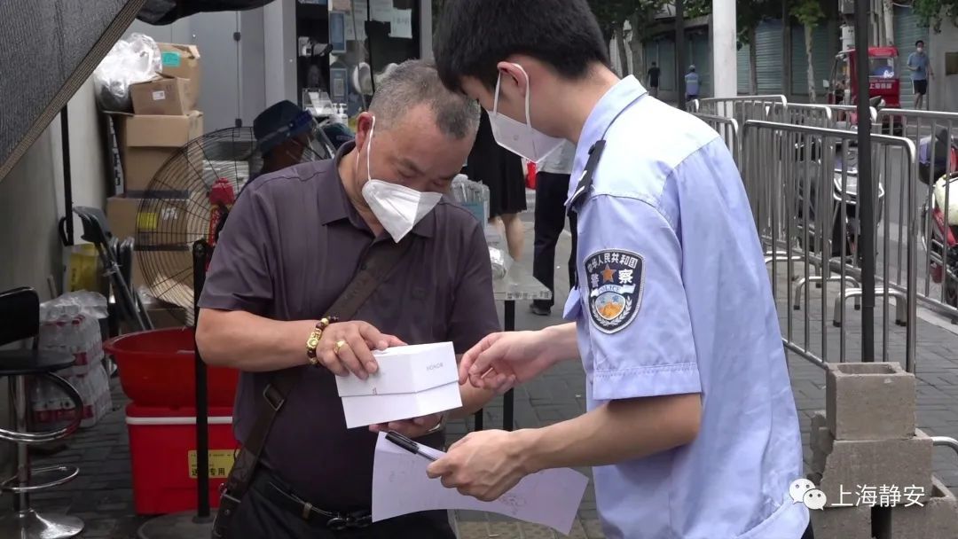 根据线索,静安警方在毕某销赃的地方,追回了被盗窃的手机,并将其交还给了核酸检测点负责人。