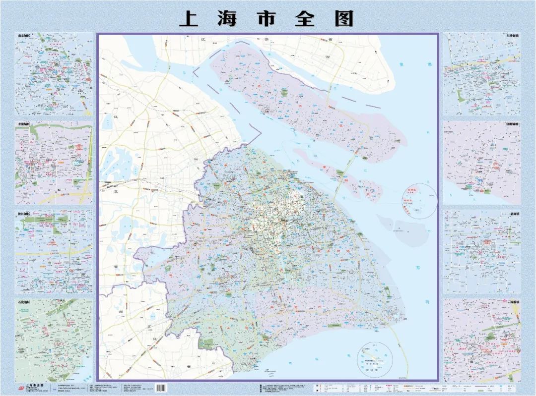 2022年新版《上海市全图》(挂图)大小为1580mm×1180mm。其核心区域包括上海市整个面貌以及与邻省的关系,主要内容包括行政区划、居民地分布、道路交通网、水系网、机场和主要码头分布、主要旅游景点分布等,以及川沙新镇、崇明城桥、惠南镇、南桥镇、嘉定城区、青浦城区、松江城区、石化地区扩大图等。