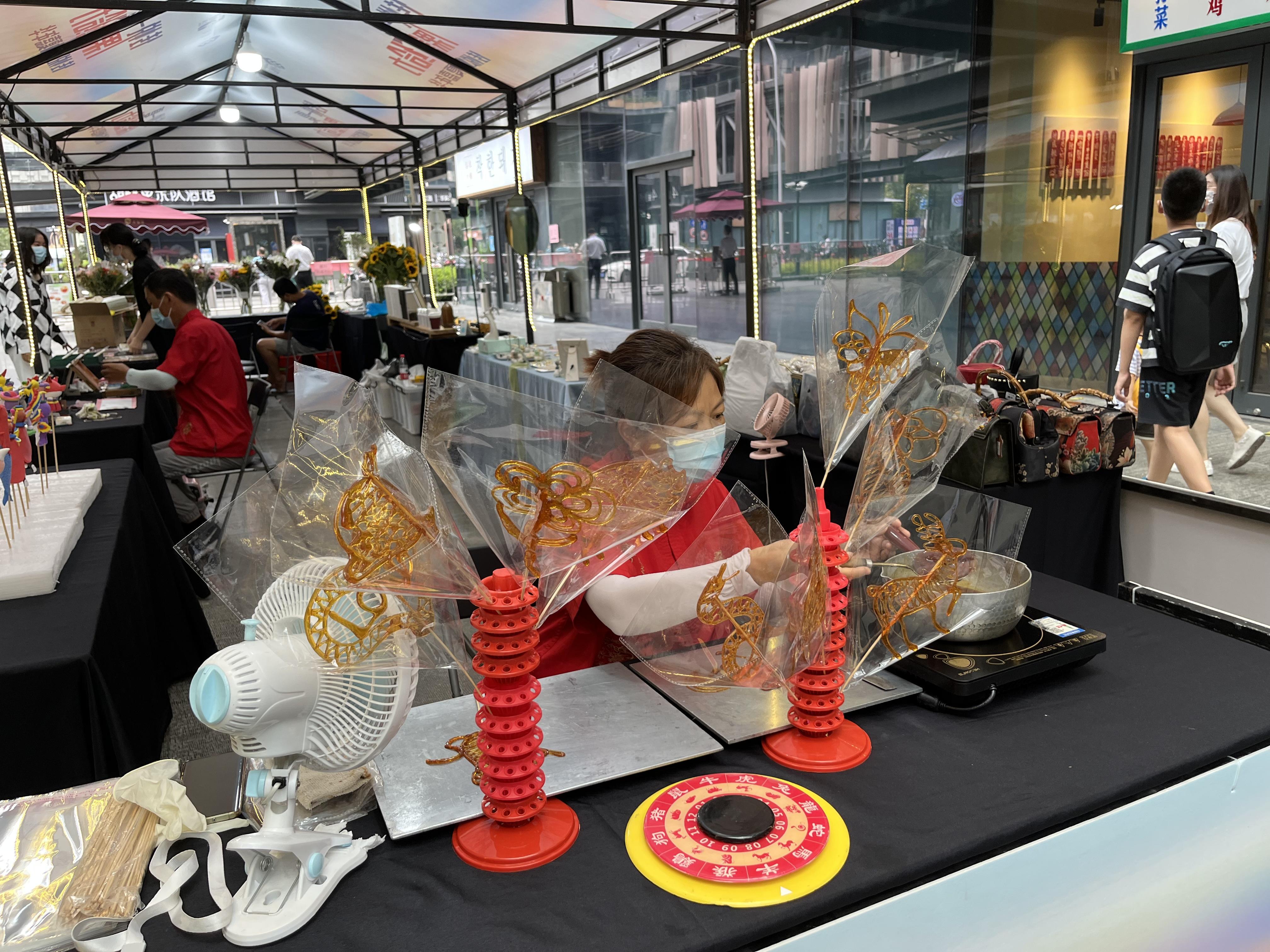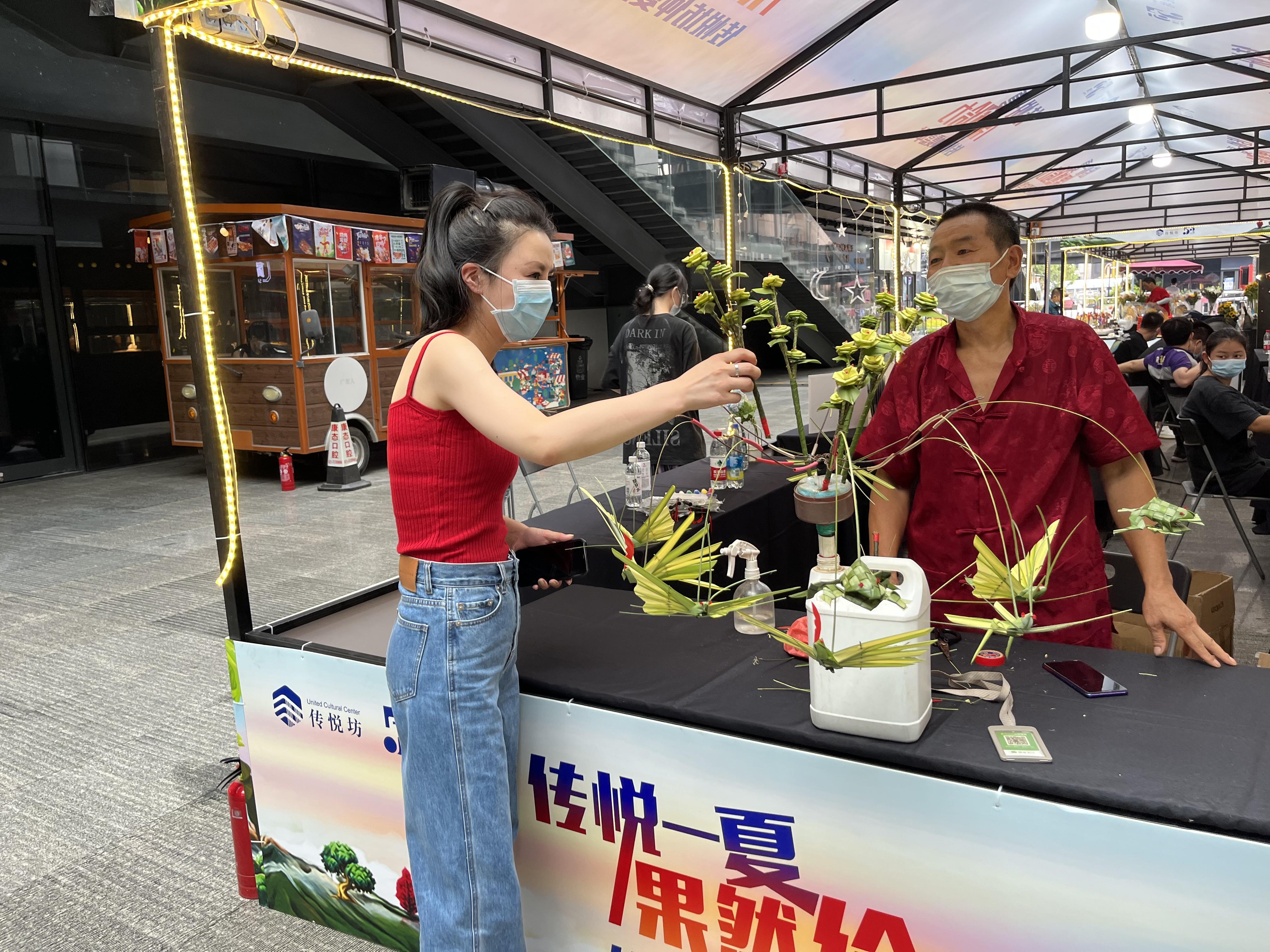 下午4点,传悦坊的仲夏嘉年华开市,在北侧露天广场,民俗文化区、游戏互动区和美食区并一字排开,冰激凌饮料餐车错落其中,方便市民边逛边玩,边玩边吃。年轻人对民间传统手艺十分感兴趣,边看边问,小朋友则被各种手工摊位吸引,跃跃欲试。