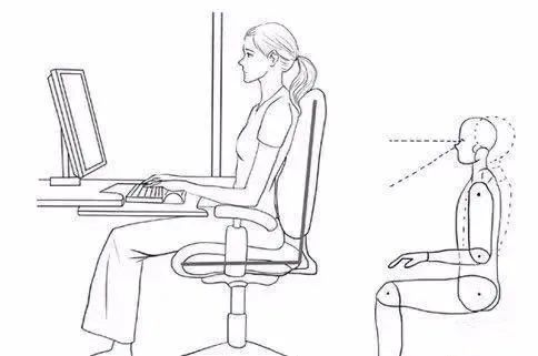 长期在电脑前工作的人,适当抬高电脑显示器,尽量不长期“伏案”工作。上身挺直,胸离开书桌10厘米,使胸背肌张力均衡,两腿平行自然放下,脚掌自然放置。