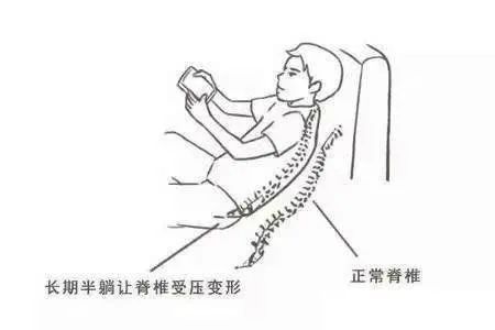 长期如此坐姿,腰椎受压,而且没有承托力,整体下沉缩短,身体的中轴线跟着后移,容易引发腰椎间盘突出,导致脊椎畸形。
