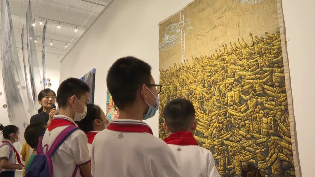 随后,这支研学游队伍来到清控人居美术馆。站在清华大学美术学院教授林乐成的《春夏秋冬》大型纤维艺术作品前,11岁的李依萌停住了脚步,惊讶地问:“这是动物的毛发做的吗?”清控人居产业园负责人冯茜解释道:“这是羊毛纤维经过工艺技巧加工后制作的一幅作品,林教授的这幅作品获得了全国美展银奖。”美术馆展示作品涵盖纤维、陶瓷、玻璃等丰富的艺术门类,浓厚的艺术氛围让孩子们大为震撼。冯茜表示:“要想设计出独具一格的工艺美术作品,学生们要大胆构想。”