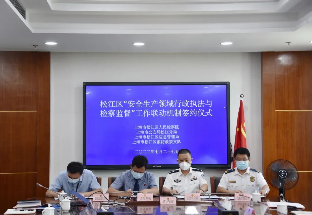 松江区“安全生产领域行政执法与检察监督”工作联动机制签约仪式日前举行,区人民检察院与区公安分局、区应急管理局、区消防救援支队签订《关于建立安全生产领域行政执法与检察监督联动机制的意见》。今后,检察机关将与行政执法部门全程联动、形成合力,筑牢守护企业安全生产的“防护墙”。