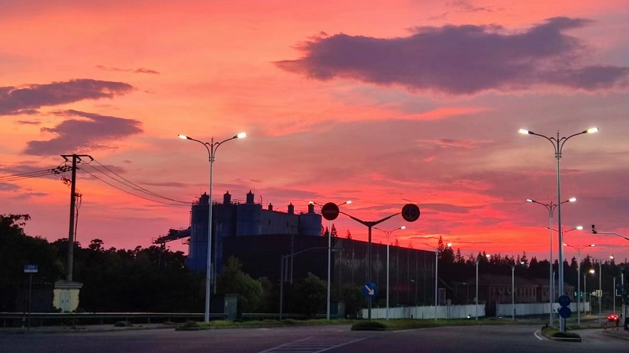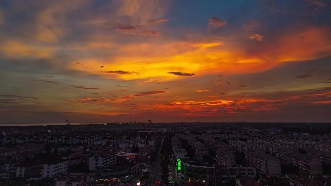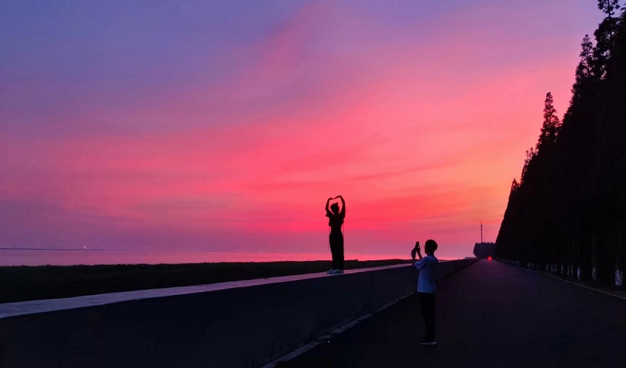 当苍茫大地还沉寂在无尽的黑暗中,远天一线处,慢慢开始泛起多彩的颜色。随着时间的推移慢慢变换着色彩,由橘黄到粉红,慢慢地变成深红。一时间崇明红霞似火,铺满了整个天空~