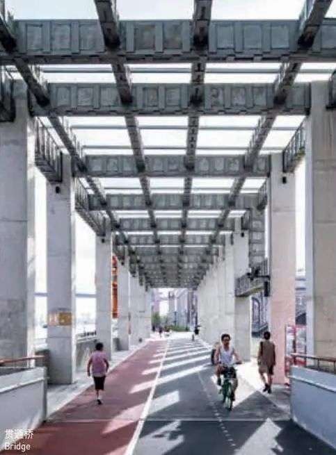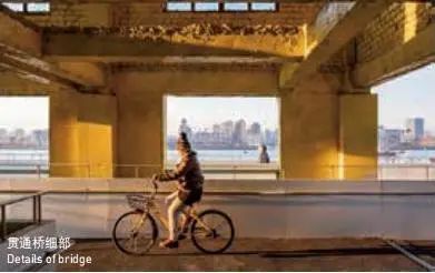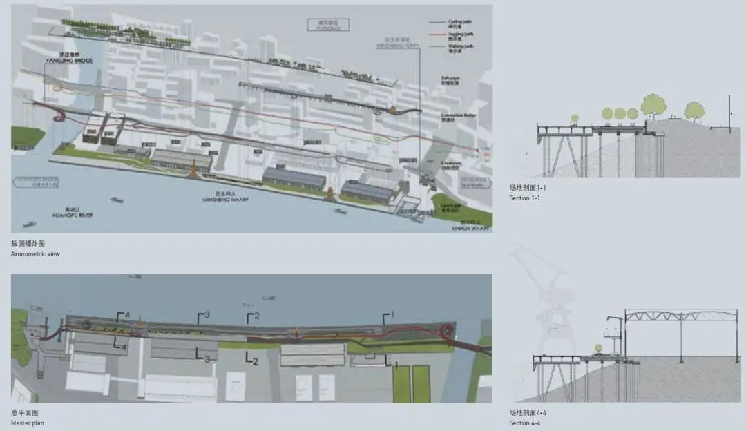 项目着眼于城市空间的整体性和延续性,通过低线慢步道、中线跑步道、高线骑行道“三线贯通”的总体设计,创造多样的慢行空间及丰富的游赏体验。设计以“艺术+日常+事件”为目标,采用“旧骨新壳、旧基新架、新旧同生”策略,在保留原有产业遗存空间特质的前提下,自东向西依次置入林木绿坡区、滨水步廊区、中央广场区、架空贯通道等活动空间,彼此叠加。