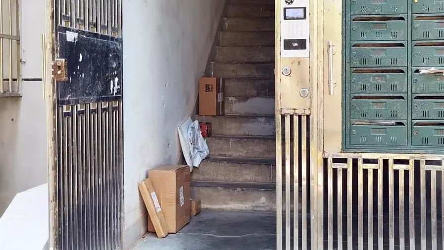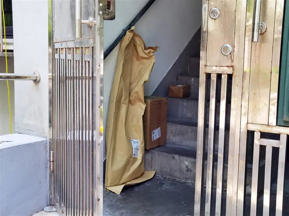 △96号楼洞开的铁门里,3个快递件挨个放在3级台阶上。其中,602室的一个快件是一个长条形大件,面单显示是一款组装家具,掂一掂重量还不轻。