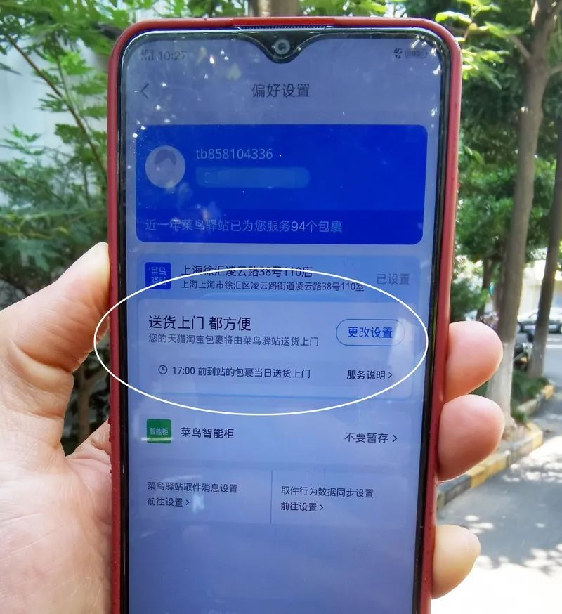 △徐女士出具的手机显示,她已设定要求菜鸟驿站必须“送货上门”。