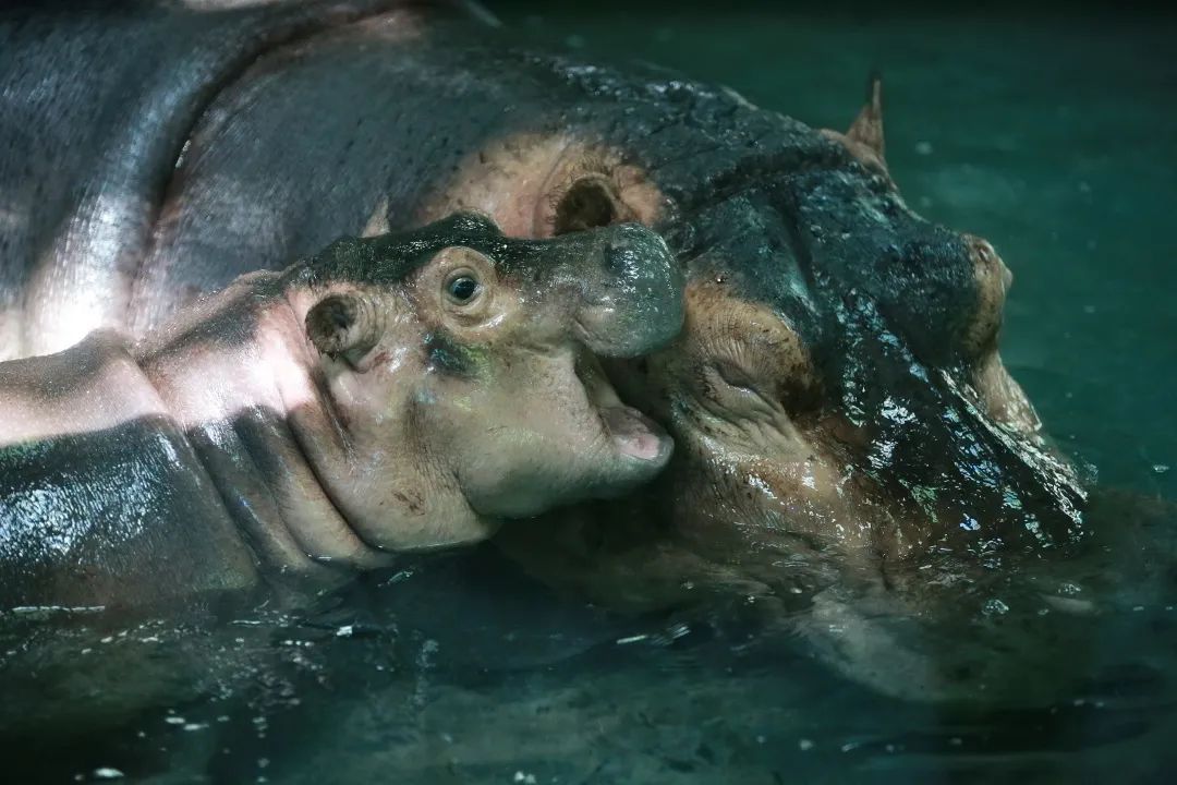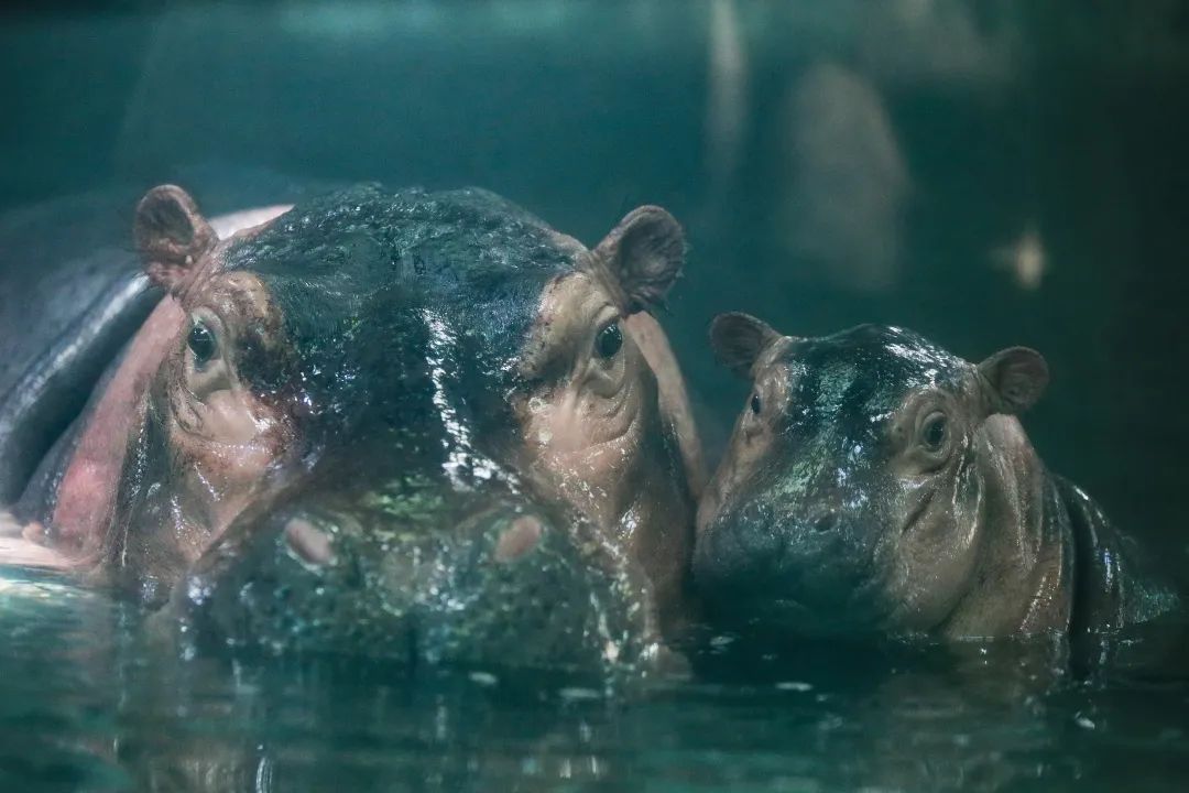 生产后的几天,“小东西”对河马宝宝寸步不离。母子俩除了吃,大部分时间都静静地躺在水里。