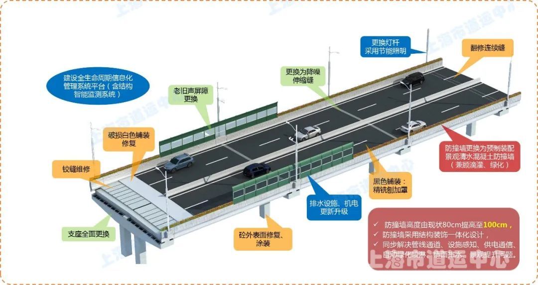 本次改造计划包括,桥梁结构功能完善提升,对存在病害的高架主体结构进行加固和病害修复,在结构安全方面进行“强筋壮骨”;