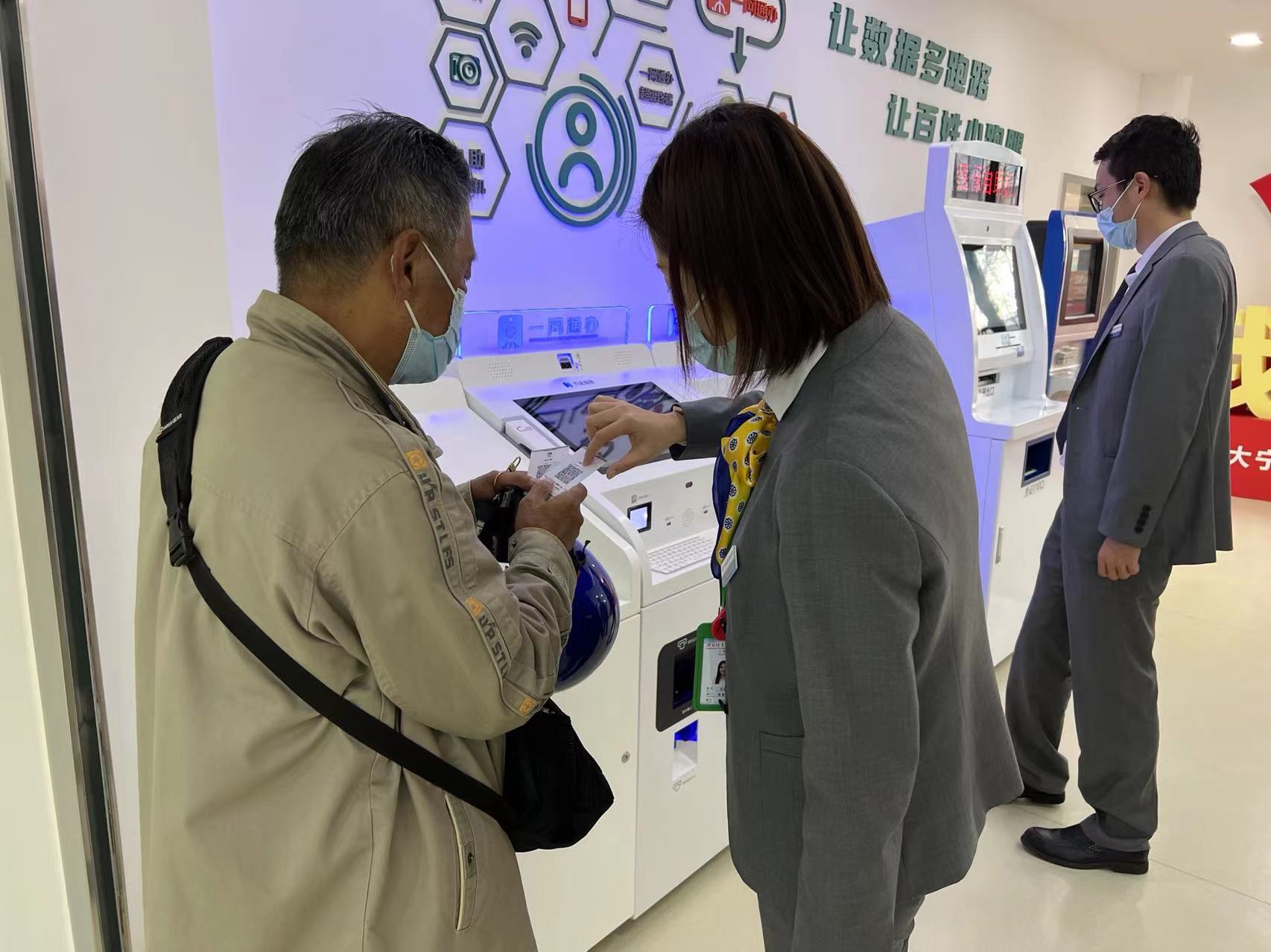 为了给居民提供更多便利,取号机也进行了优化升级,只需在取号机上通过使用身份证、随申码一次取号,就可同时完成测温、亮码、取号流程,叫号后系统上也会同步显示办事人员的身份信息,无需再次身份验证。