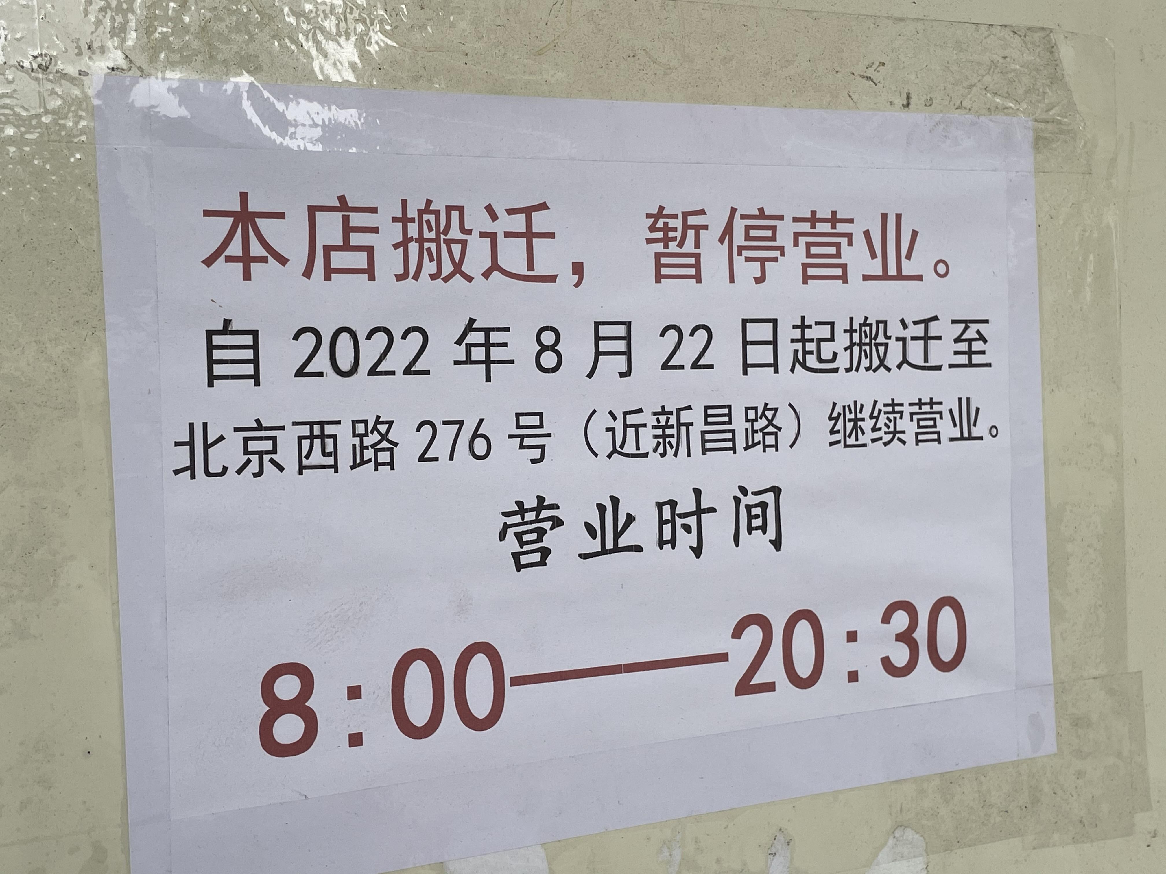 8月24日上午,记者在北京东路西藏中路口看到,老店已经拉下卷帘门。店门口,张贴着一张告示:本店搬迁,暂停营业。自2022年8月22日起搬迁至北京西路276号(近新昌路)继续营业。