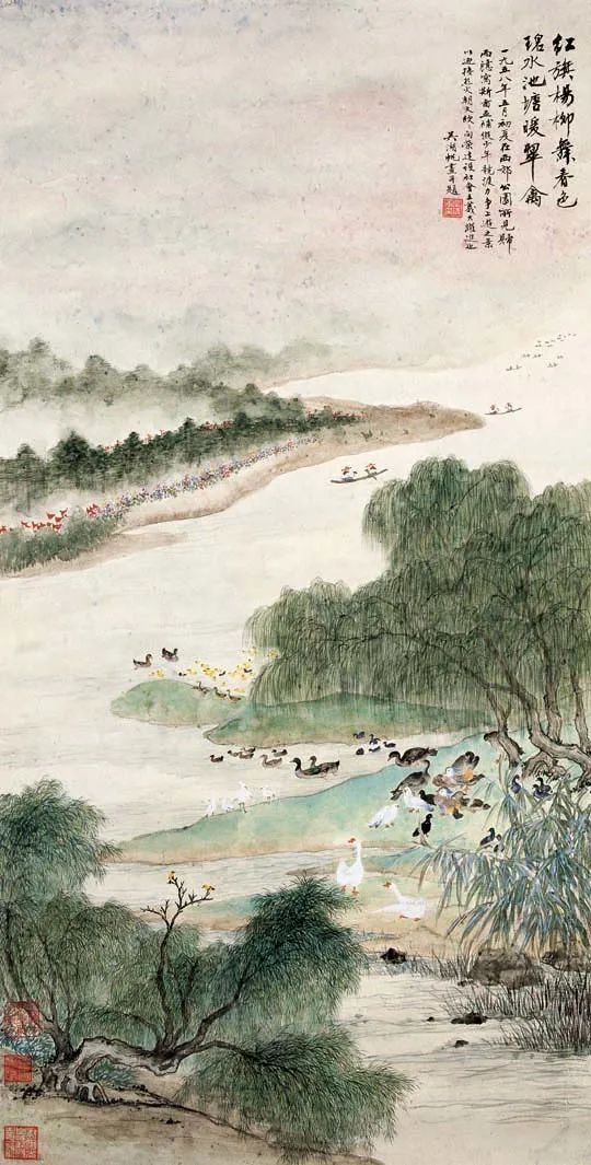 墨笔好事烘染,有烟云苍茫、泉石浩荡之致。花卉竹石亦由陆廉夫、恽南田而上探宋人堂奥,清丽雅隽,如玉人临风。没骨荷花,参以冲粉冲水之法,丰神绰约,南田之外,演为新调。行楷胎息董其昌、宋徽宗而得米南宫《多景楼诗》神髓,清健超拔。