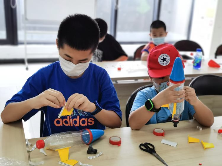 活动中,小朋友们除了学习运载火箭发射升空的基本知识外,还了解了一些基本的空气动力学和飞行力学等方面的知识,并在老师的指导下做起了水火箭。在实践发射现场,一支支“水火箭”载着一个个梦想成功升空,并开出美丽的“降落伞”,让小朋友们近距离感受到水火箭发射升空的震撼。