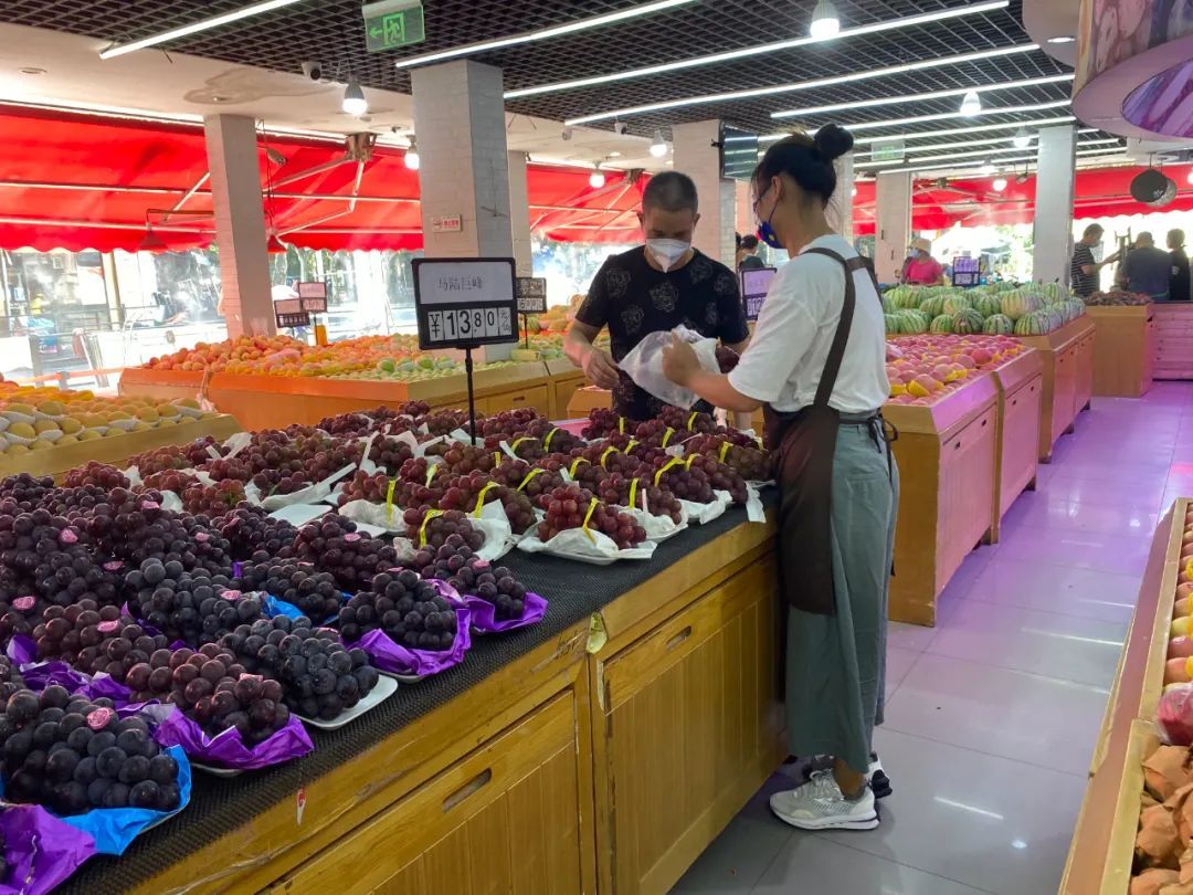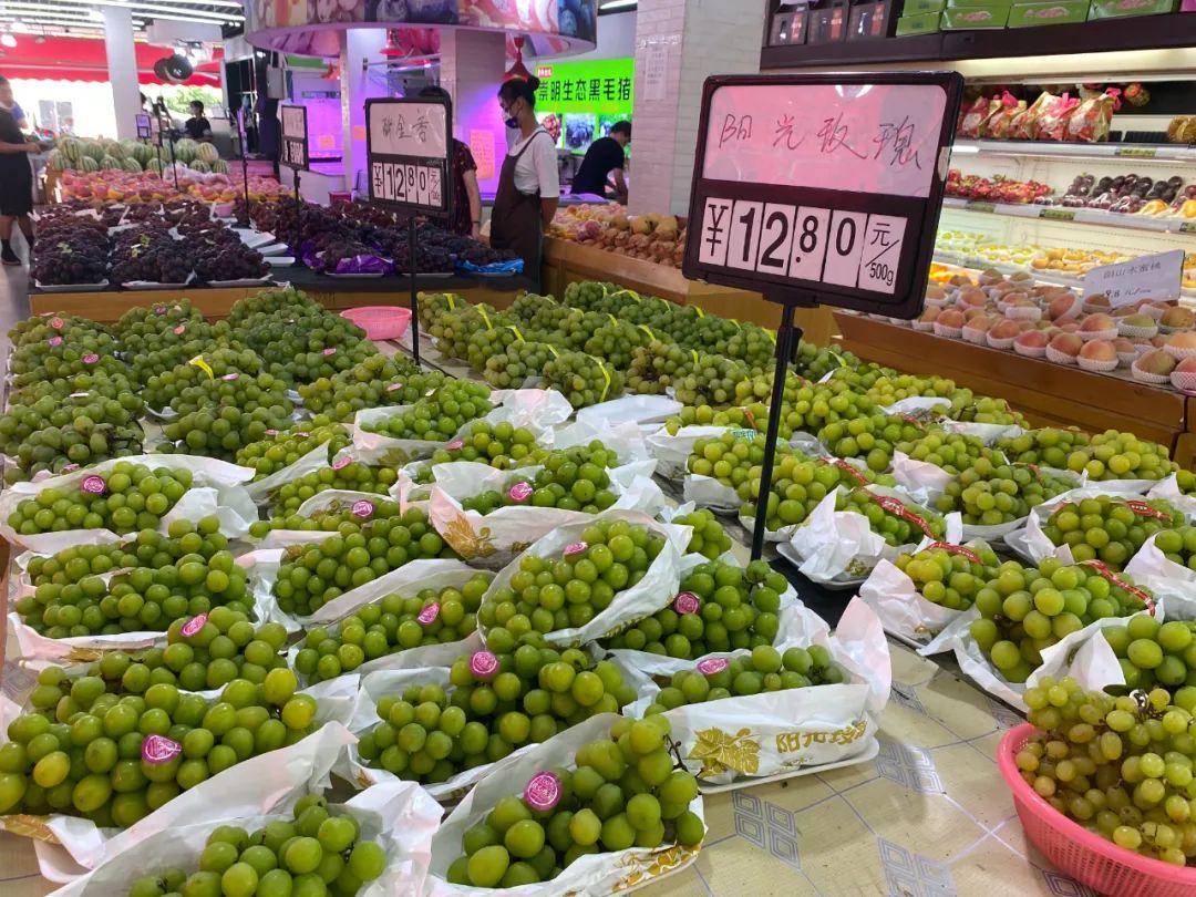 走进水果店,葡萄摊位十分惹眼,红黑色的巨峰和夏黑、黄绿色的阳光玫瑰和醉金香,摆了满满两个柜台。