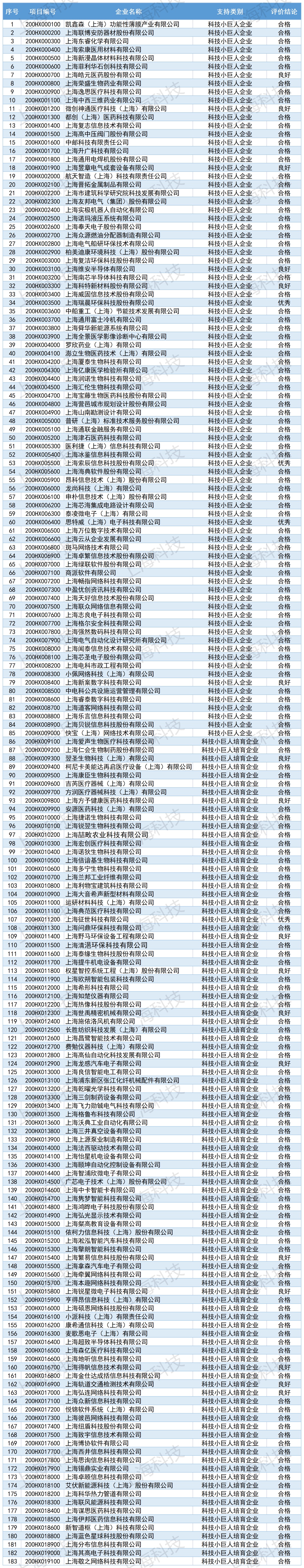 根据《关于开展2022年度上海市科技小巨人(含培育)企业综合绩效评价工作的通知》(沪科〔2022〕34号)要求,经自主申报、综合绩效评价,“上海瑞晨环保科技股份有限公司”等4家科技小巨人(含培育)企业评价为“优秀”,“上海皓元医药股份有限公司”等17家科技小巨人(含培育)企业评价为“良好”,“凯鑫森(上海)功能性薄膜产业有限公司”等162家科技小巨人(含培育)企业评价为“合格”,5家科技小巨人(含培育)企业评价“未通过”。现将综合绩效评价通过名单予以公布。