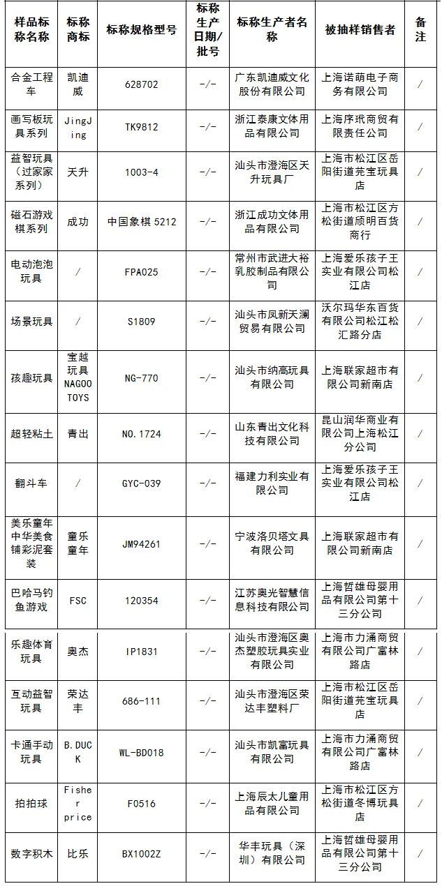 松江区市场监督管理局近期对本区销售的儿童玩具产品质量进行了监督抽查。本次抽查了11家流通企业20批次产品。