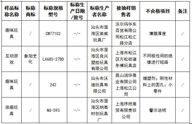 2022年上海市松江区儿童玩具产品质量监督抽查不合格产品