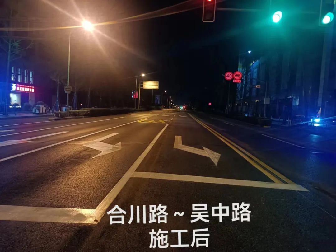 增加了一条左转专用道,并设置了左转待行区,在不改变红绿灯运行时间的前提下增加了左转车辆的通行效率,有效缓解了合川路南向北交通拥堵现象。