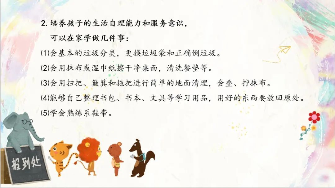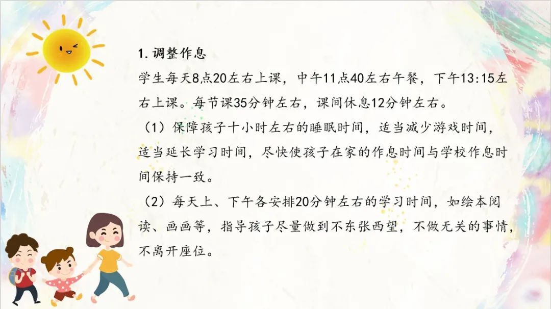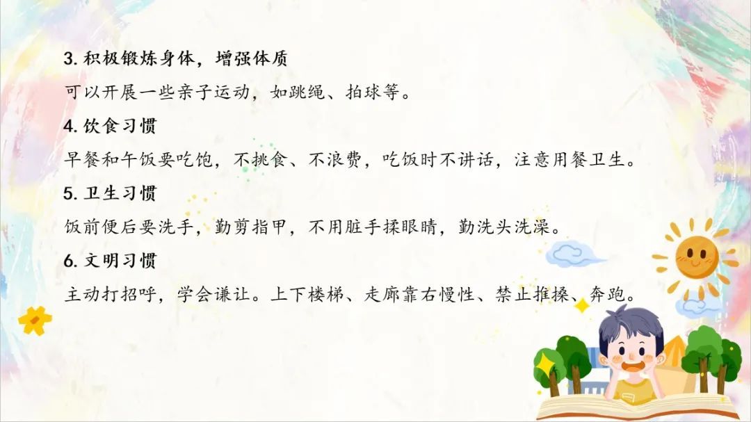 在信中,可以从这六个方面入手,在作息调整、身体锻炼、饮食习惯、卫生习惯、文明习惯等方面指导家长在假期循序渐进地做好孩子适应工作,帮助孩子在开学后能更加顺利地适应小学生活。