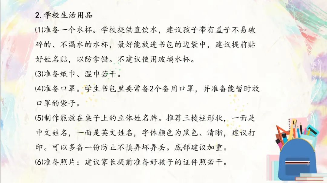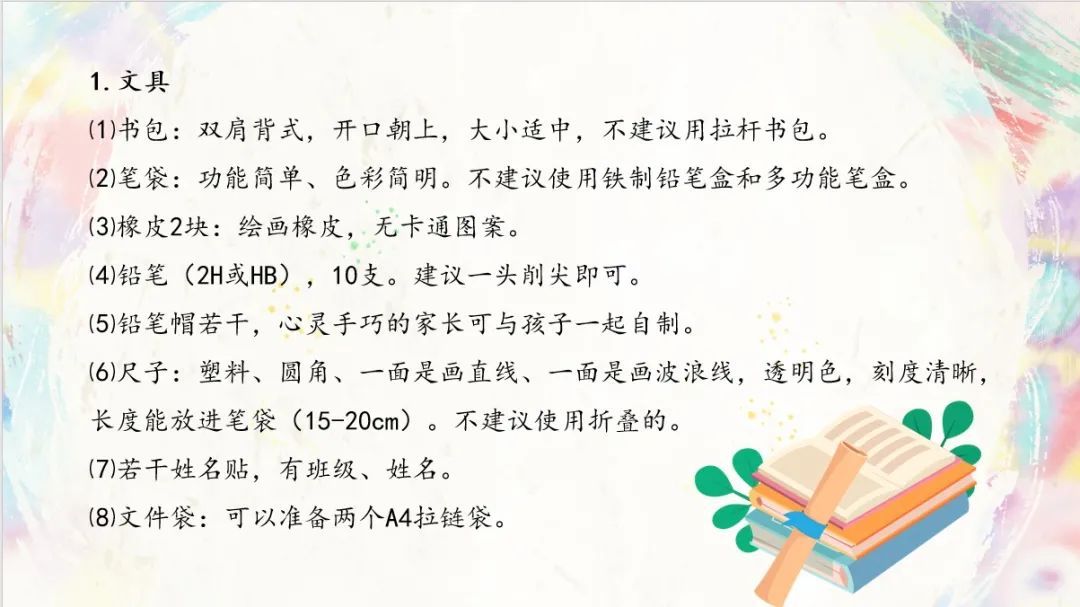 不少家长不是非常明确要给孩子准备哪些物品,置办起来难免匆匆忙忙,若能提早告知家长必要的物品准备,那么家长和孩子将会更加从容地面对一年级的学习。