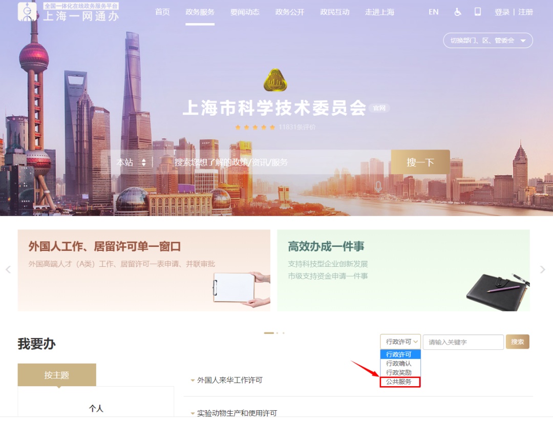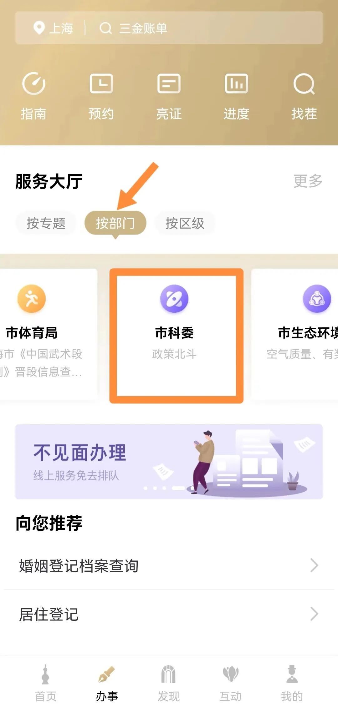 在“办事”频道的“服务大厅”点击“按部门”按钮,选择“市科委”;