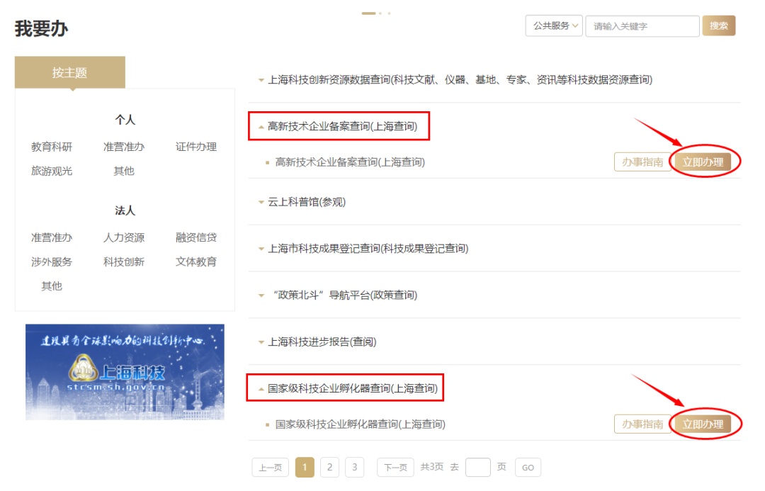 在“市科委”频道选择“公共服务事项”,点击“高新技术企业备案查询”或“国家级科技企业孵化器备案查询”的“立即办理”按钮,即可在线申请。