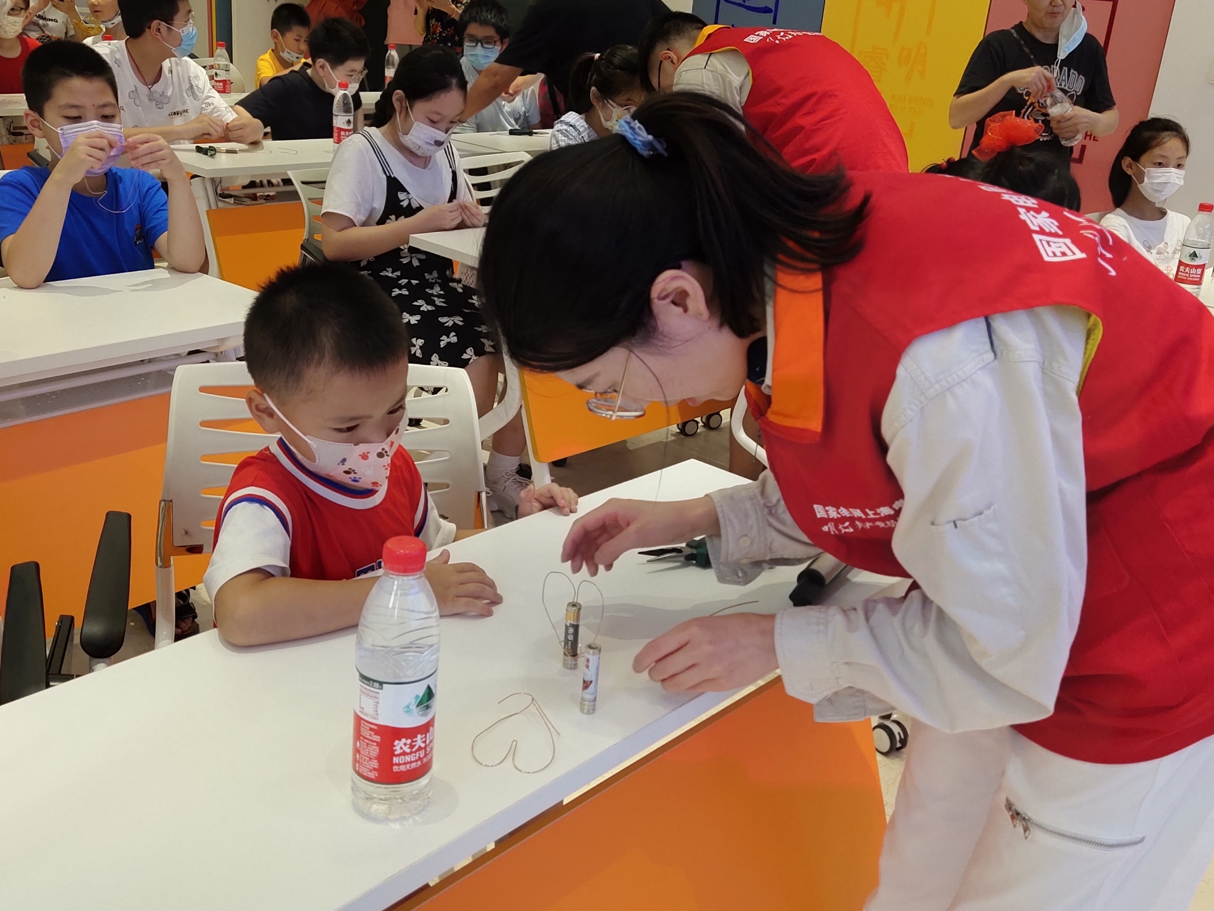最让孩子们兴奋的,莫过于电磁实验环节了。亲手捏制线圈并成功让它自转起来,“发电”就成功了。趁着孩子们好奇心满满,讲师们趁热打铁分享起科学用电的小常识,小朋友们听得十分认真。