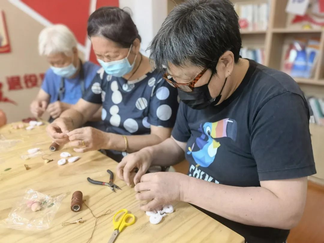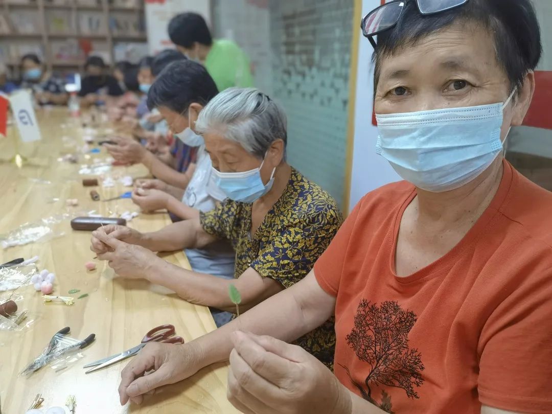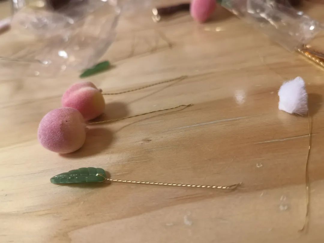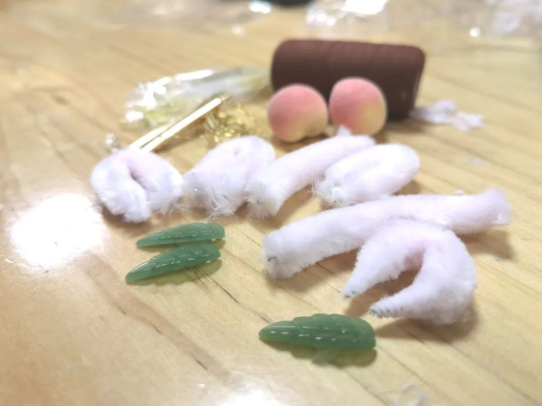 将打过尖的绒条进行造型和组合,搭配做好的绿叶、琉璃珠等辅助材料,经过一系列的“魔法”,一朵朵栩栩如生、惟妙惟肖的“桃花”在学员们指尖绽放。
