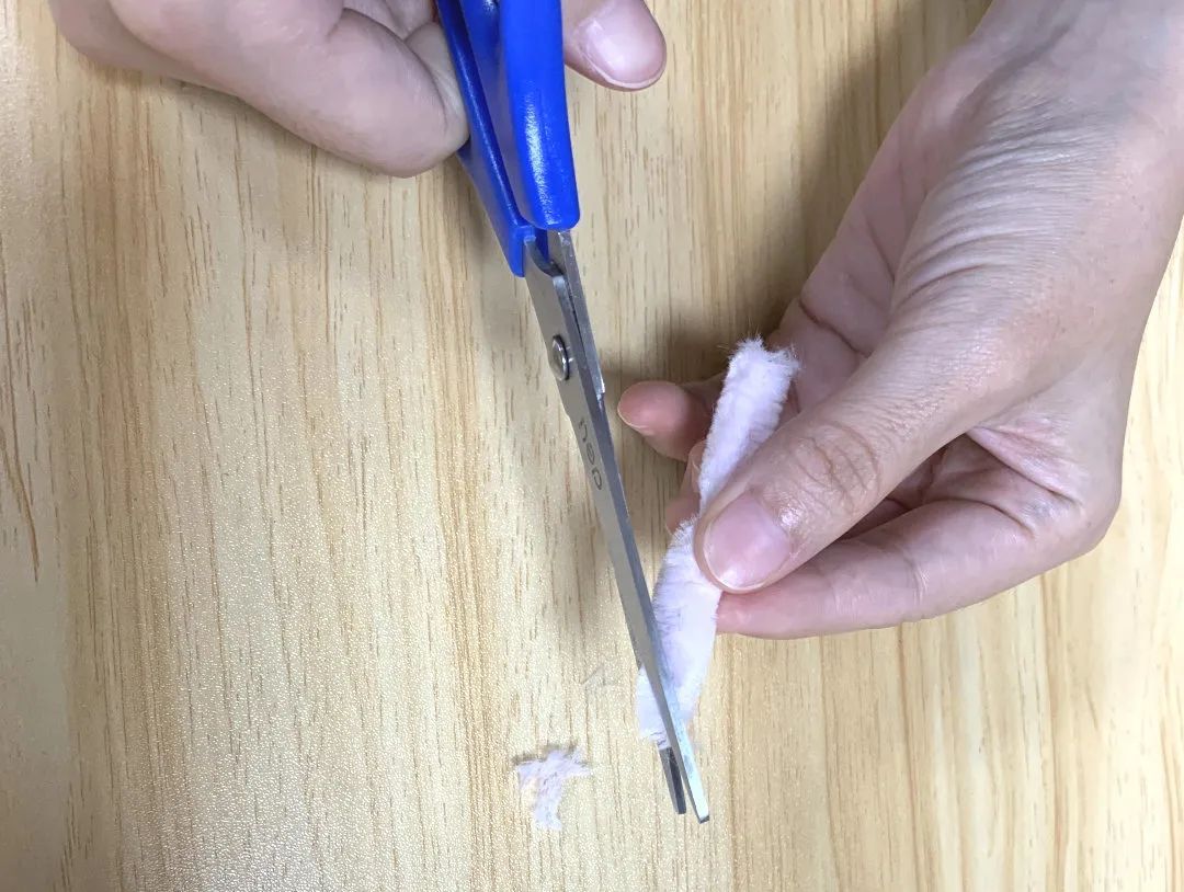 现场,我们省略煮丝、染色、烧丝、滚绒等准备步骤,从打尖开始今日绒花簪花——桃花簪的制作。一把把剪刀在学员们手中轻快地“咔咔”起来,细细的绒毛随之飞舞。绒条在大家的手中逐渐变成圆形、锥形、弧形等形状。