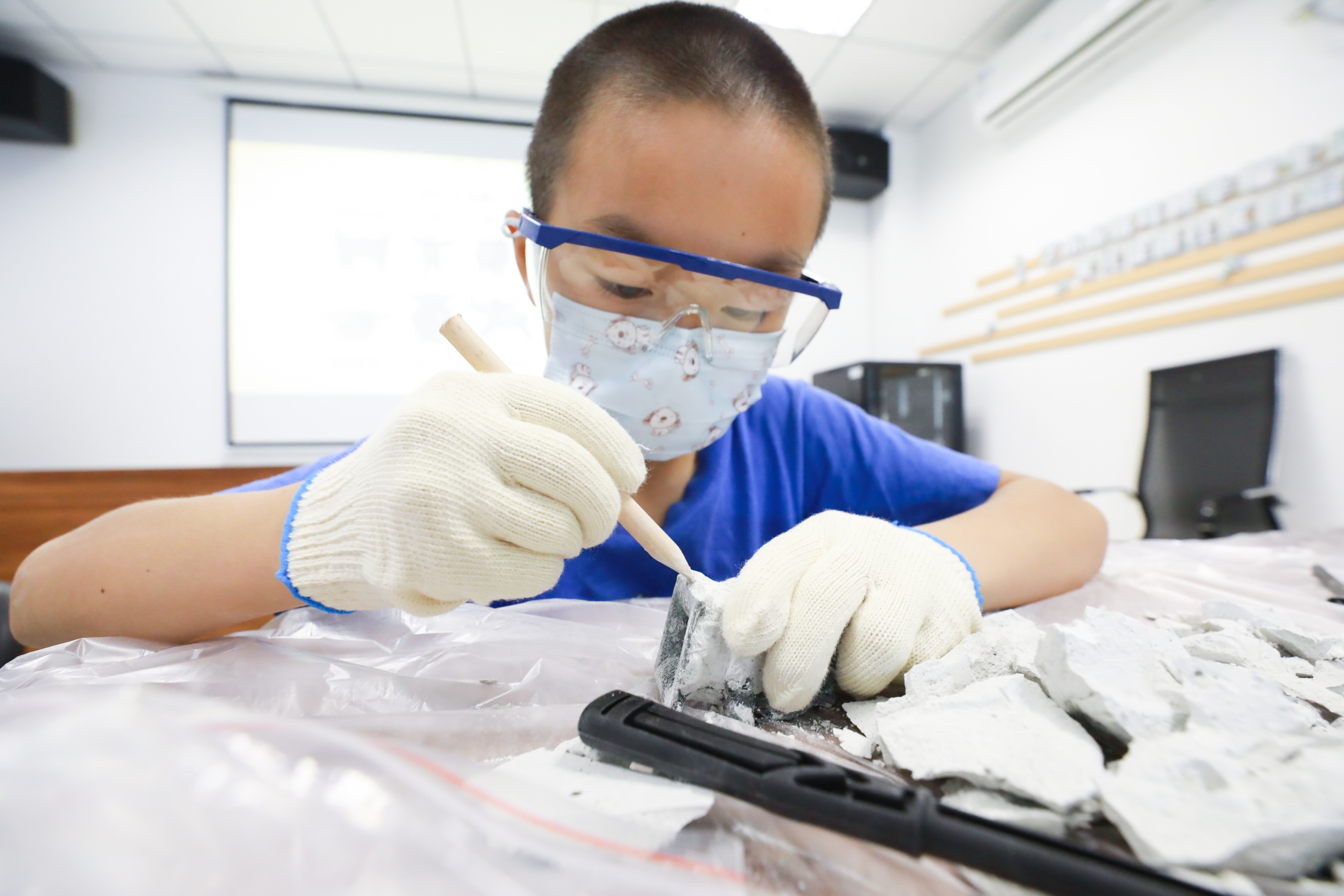在听专业人士介绍了考古发掘的相关知识和文物保护的法律法规后,每名“小小考古家”都分到了一个考古盲盒。随后,他们迫不及待地戴上眼镜、手套,用小锤子、挖掘棒和刷子小心翼翼地“挖掘”出深藏在其中的“文物”。“今天参加这个活动很开心,不仅学到了文物知识,更了解到保护文物的重要性和考古发掘工作流程。”小朋友朱恺文说。