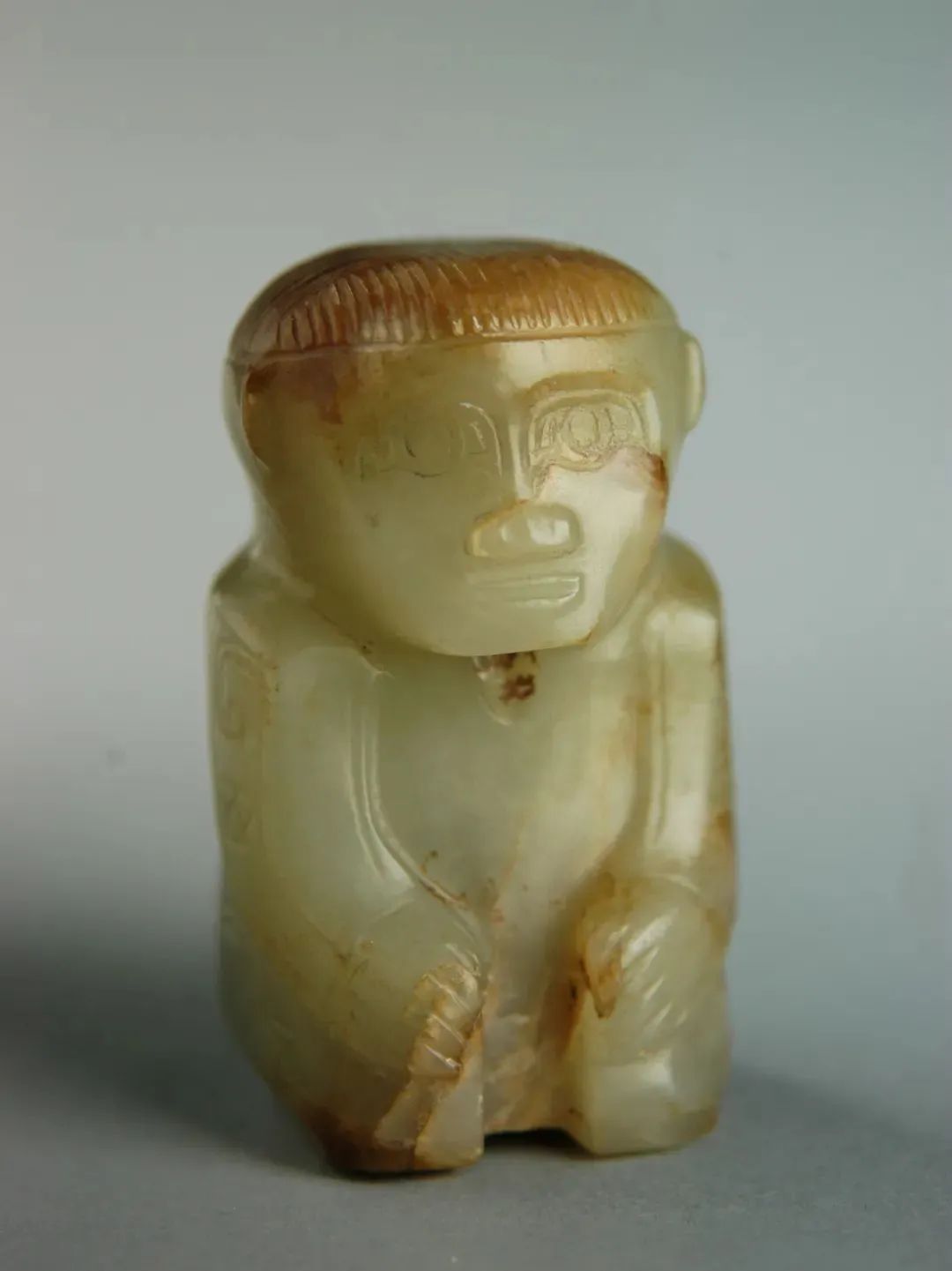 石家河文化分布在江汉流域一带,常见出土人物和动物形态的玉器。玉人一般是人首造型,未见全身人像。上博所藏玉神人,品相完好,玉质晶莹剔透,制作工艺高超,在海内外目前仅此一件。其头戴平顶冠,两耳饰环,双手置于胸前,一般认为这是古代巫师正在做法、通神的形象。