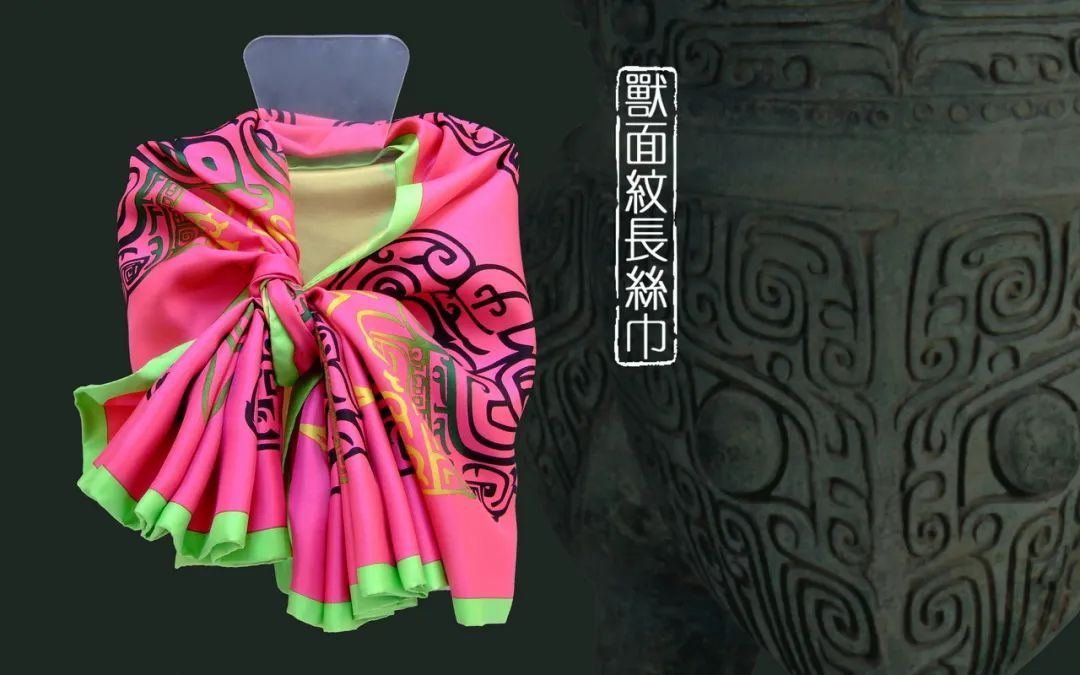 饕餮是一种想象中的神秘怪兽,是青铜器常见纹饰,也称兽面纹。丝巾纹饰源于上博馆藏青铜器上的兽面纹,有神秘之味,又有吉祥之意。