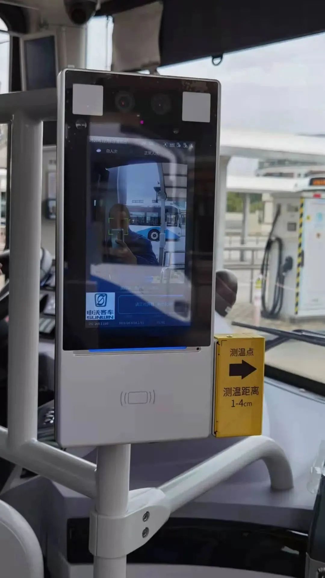 此外,新车型还增加了智能识别测温仪和紫外线消毒灯两大功能。当乘客没戴口罩与乘客体温异常时,会有语音提示播报,设备测温报警阀值为37.3度,超过阀值会语音报警并把数据自动上传后台。