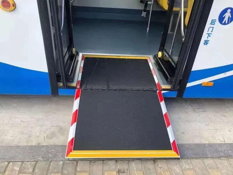 当遇到推着轮椅出行的特殊乘客,徐闵线驾驶员便会开启相关按钮键,新添置的“侧跪”功能便开始启动,车身往右侧倾斜一个角度,当车门台阶与地面的距离降至一定距离后,打开无障碍轮椅导板搭在公交站点的石阶上,可帮助特殊乘客顺利上车,并在“无障碍区域”面朝车后固定轮椅。