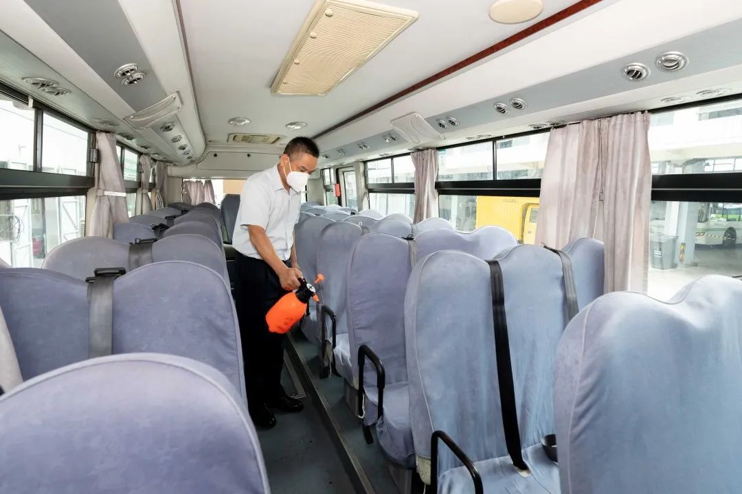 除了安全检修,消杀工作同样不容忽视。消杀过程中,工作人员尤其注意对车门、把手、过道、座椅等学生高频接触的设施表面用消毒剂进行喷洒和擦拭,确保对车内设备消杀全覆盖。开学后,崇明巴士公司也将严格按照防疫要求,为师生们全力营造安全健康的乘车环境,切实筑好校园防疫墙。