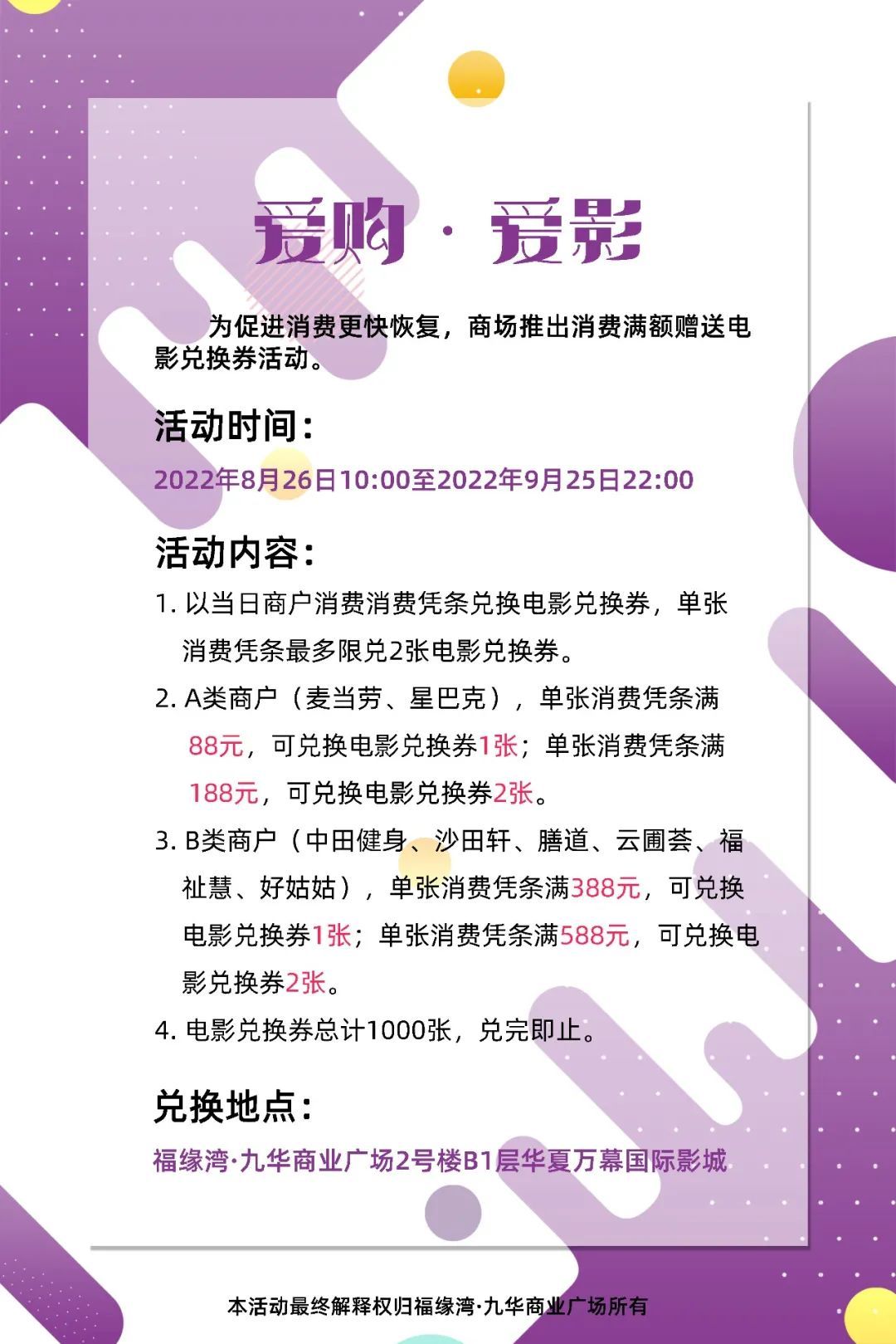 据悉,福缘湾·九华商业广场还积极配合上海市开展电子消费券发放工作,即日起推出“消费满额赠送电影兑换券”活动,活动持续一个月,感兴趣的市民可前往参与体验。