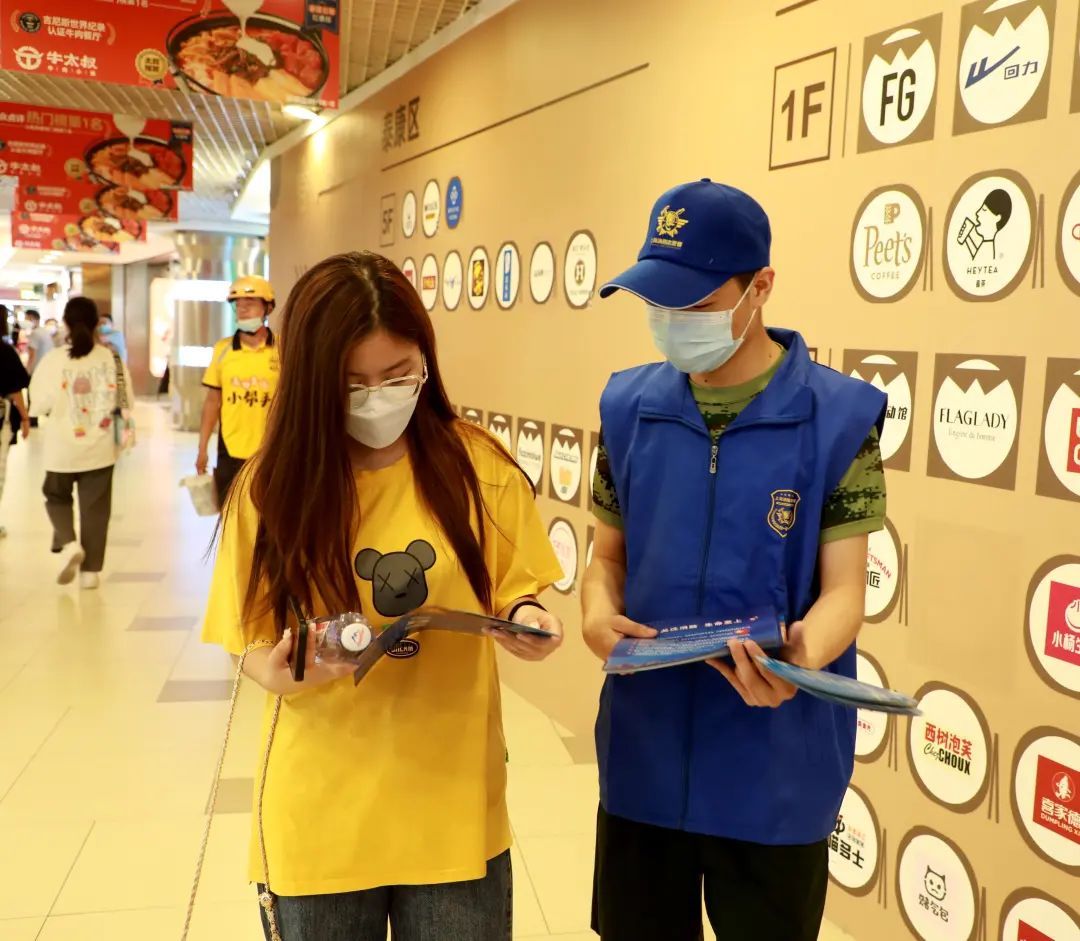 在活动中引人注目的还有一群身穿蓝色马夹的“消防志愿者”,由热心消防公益志愿服务的市民组成。他们穿梭在商场里,协助市民群众扫码注册全民消防学习平台、辅导积分学习教程、宣传消防知识,无形之中成为当晚宣传活动里一道亮丽的“移动风景”。