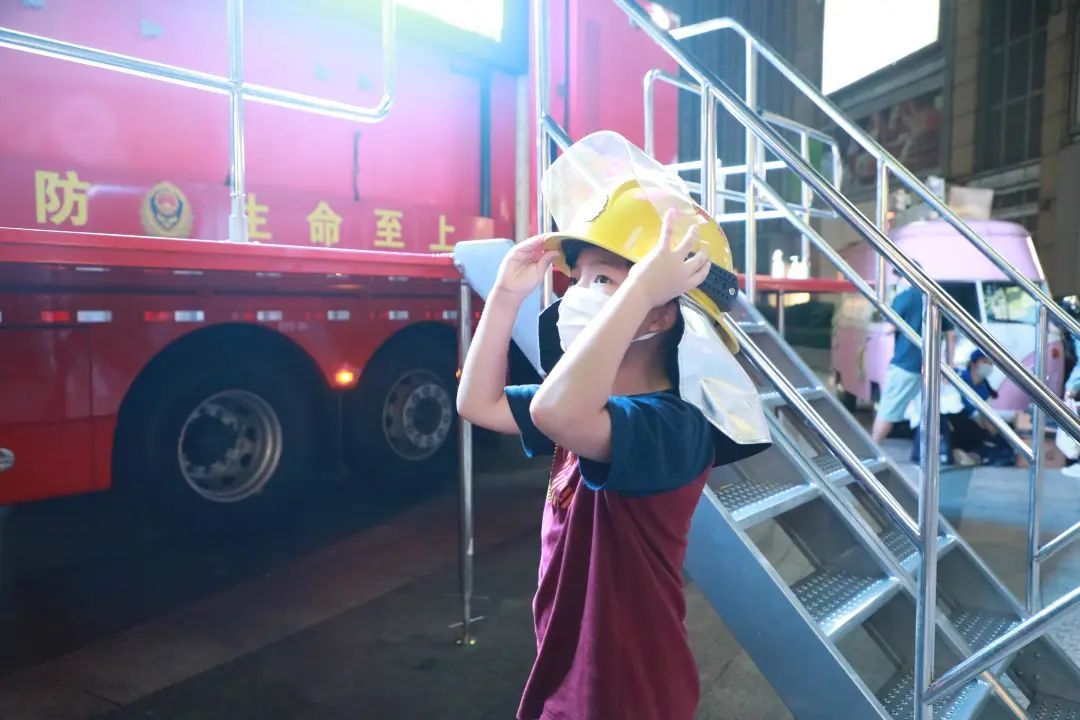 在互动体验区,“蓝朋友”们为小朋友准备了惊喜——定制版迷你消防员战斗服!没有一个小朋友能拒绝这酷飒的体验!在“蓝朋友”的帮助下穿上战斗服、戴上头盔,是不是又萌又飒呢?