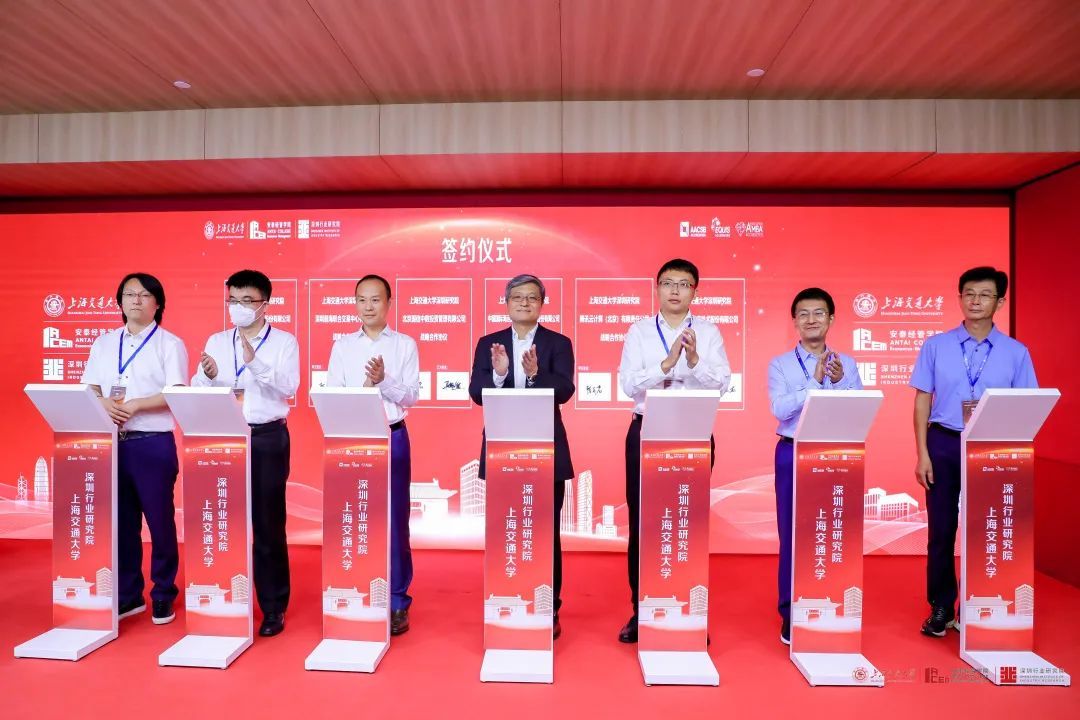 在现场领导和嘉宾的见证下,上海交通大学与腾讯集团腾讯云有限公司、国家信息中心国信中数投资有限公司、中国国际海运集装箱(集团)股份有限公司、深圳前海联合交易中心有限公司、上海观安信息技术股份有限公司和全拓科技(杭州)股份有限公司现场签署了战略合作协议。