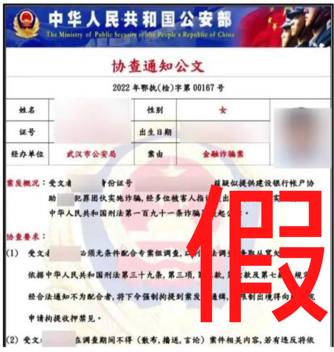 以涉嫌银行卡诈骗,洗钱犯罪等理由,同步发送伪造的公检法官网通缉令等文件,对受害者进行恐吓。