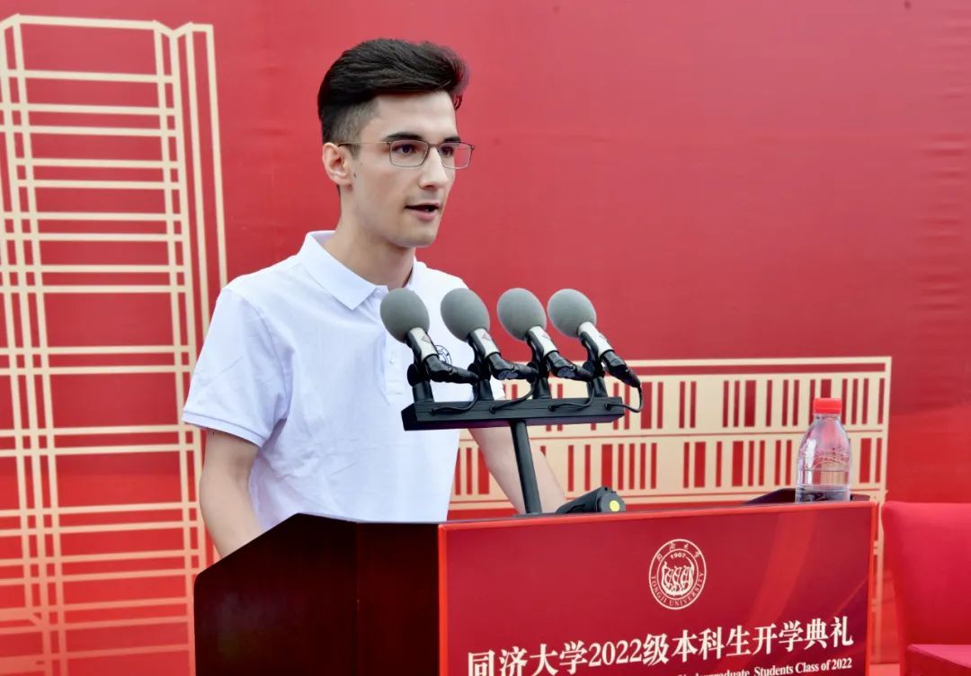 国际文化交流学院2022级汉语言专业本科生、来自罗马尼亚的张利(GRIGORIU NICOLAE RARES)作为留学生新生代表发言。“同济大学作为中国著名高校,有着悠久的历史和深厚的底蕴,‘同舟共济’的校训更是深深吸引了我。”他用流利的中文说,我们正踏上新的学习之旅,要认真学习专业知识与技能,做到德业齐行并进,树立远大的志向,实践“同济天下”的崇高理想。