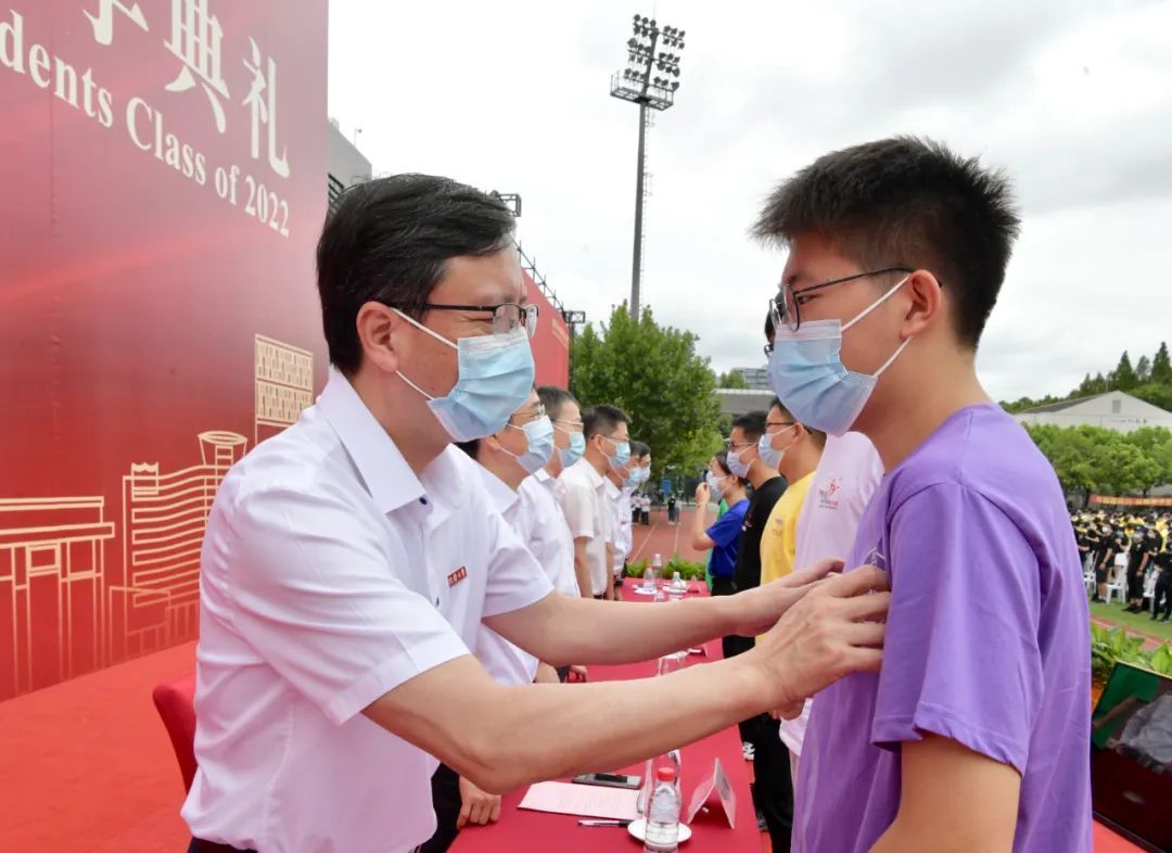 上海中学校长冯志刚代表中学发言。“我认真思索后写下了今天的发言题目‘跑好这一棒’,是对同学们的期待,也是对同济大学的信任。”他说,同学们在同济的未来四年里跑好人生的重要一棒有很好的基础。进大楼、去实验室、找自修教室,敲大师办公室的门,与身边的“小先生”交流等等,做到这些就能“跑好这一棒”。如果同学们能把同济大学读小了,那你就由小变大了,就成功了。相信同学们都能跑好大学四年的这一棒,希望你们都能成为国家栋梁。