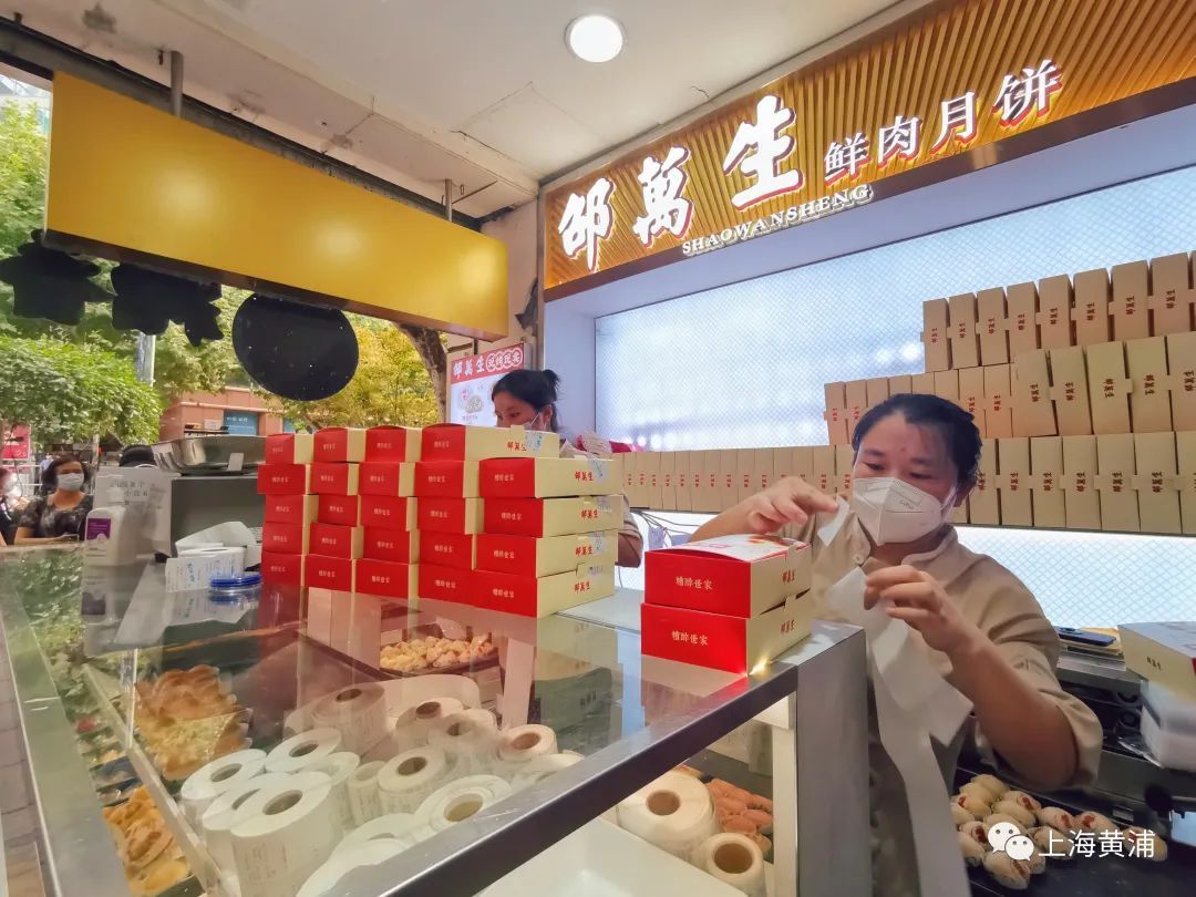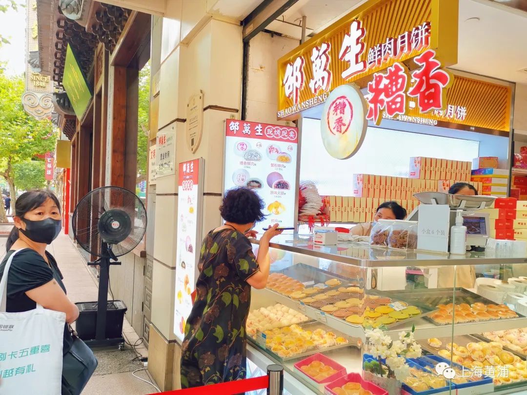 中午时分,虽然酷热未消,但挡不住食客们的脚步。南京东路上的邵万生门口排起长龙,不少阿姨、爷叔都是赶在中秋来临前,买几盒糟香鲜肉月饼回去,跟子女、亲戚分享的。