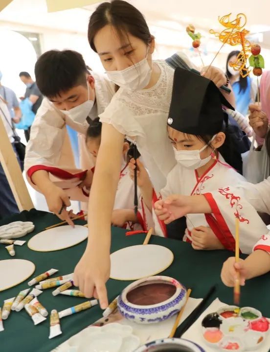 在商场三楼中庭天桥,活动还为广大亲子家庭设立了古风市集,设有非遗体验区、手工互动区。制作团扇、画糖画、糖葫芦、竹编、捏面人等等……为参与“开笔礼”活动的家庭提供了多种场景体验。