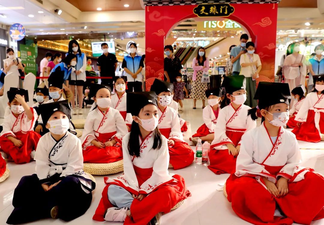 8月27日,“知书尚礼,童蒙养正”百联又一城第二届“开笔礼”活动在五角场商圈举行。 “开笔礼”是中国传统对少儿开始识字学礼的一种启蒙教育形式,也是古代读书人的四大礼之一。
