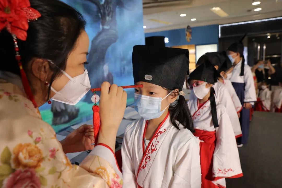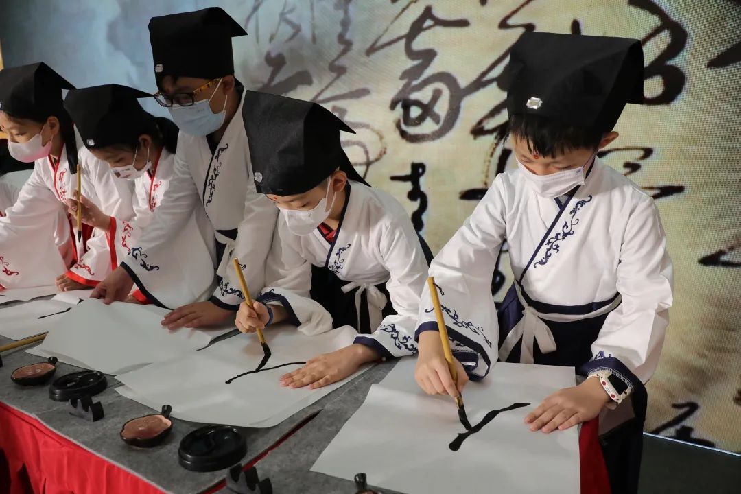 活动现场,身穿崭新汉服的小朋友穿过“文殊门”,列队而坐,通过庄重的仪式——“正衣冠”、“诵经典”、“朱砂启智”、“书写人字”、“击鼓鸣志”,在老师和父母的共同见证下,感受传统文化,开启人生求学生涯的第一步。